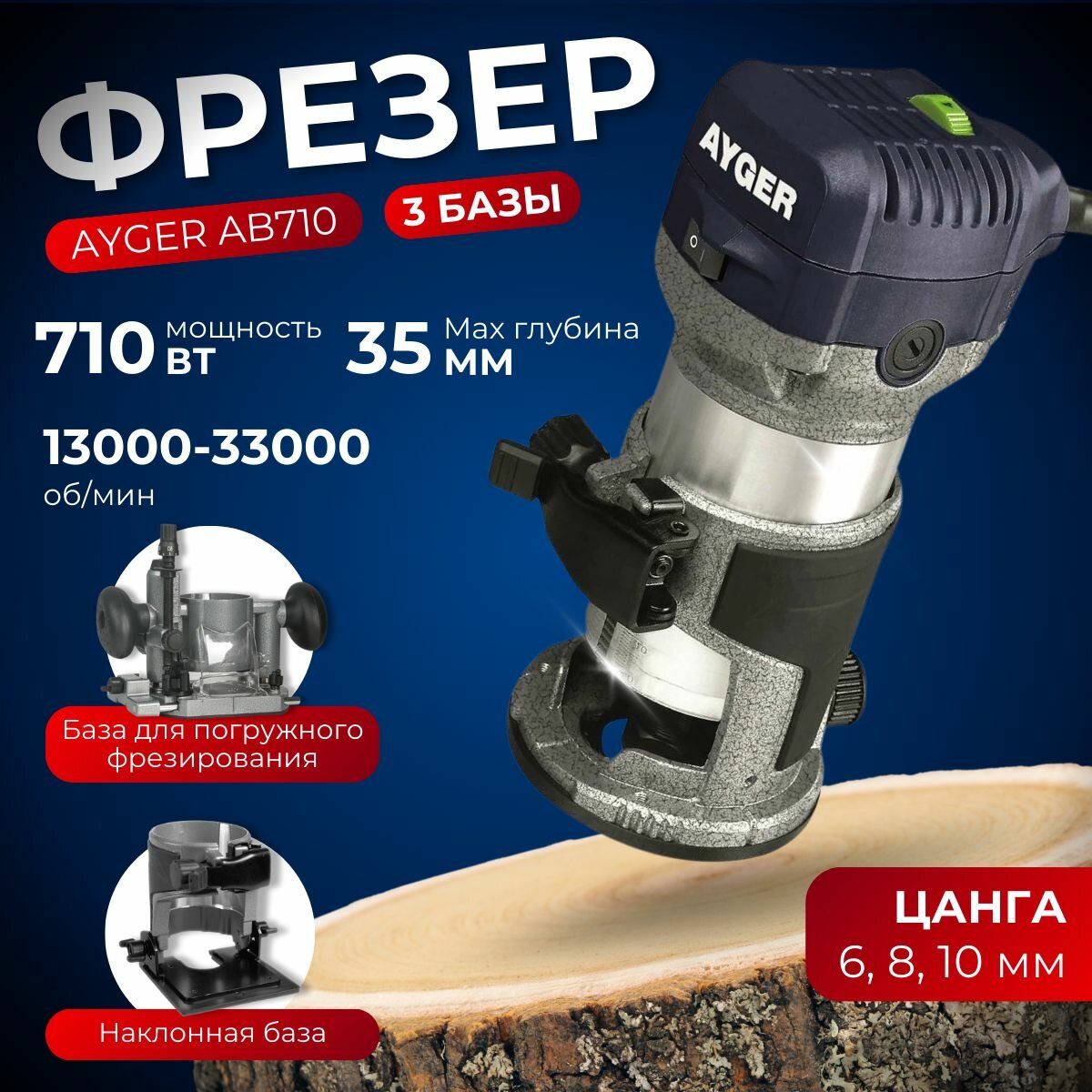 Фрезер кромочно-петельный AYGER AB 710 ( 710 Вт, 13000-33000 об/мин, 6/8/10 мм )