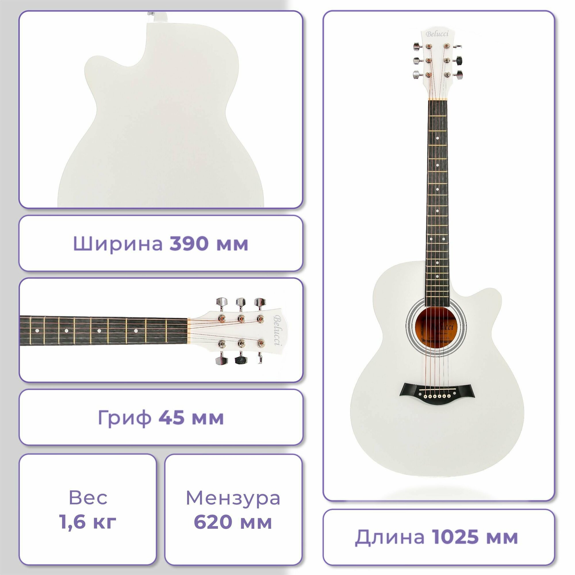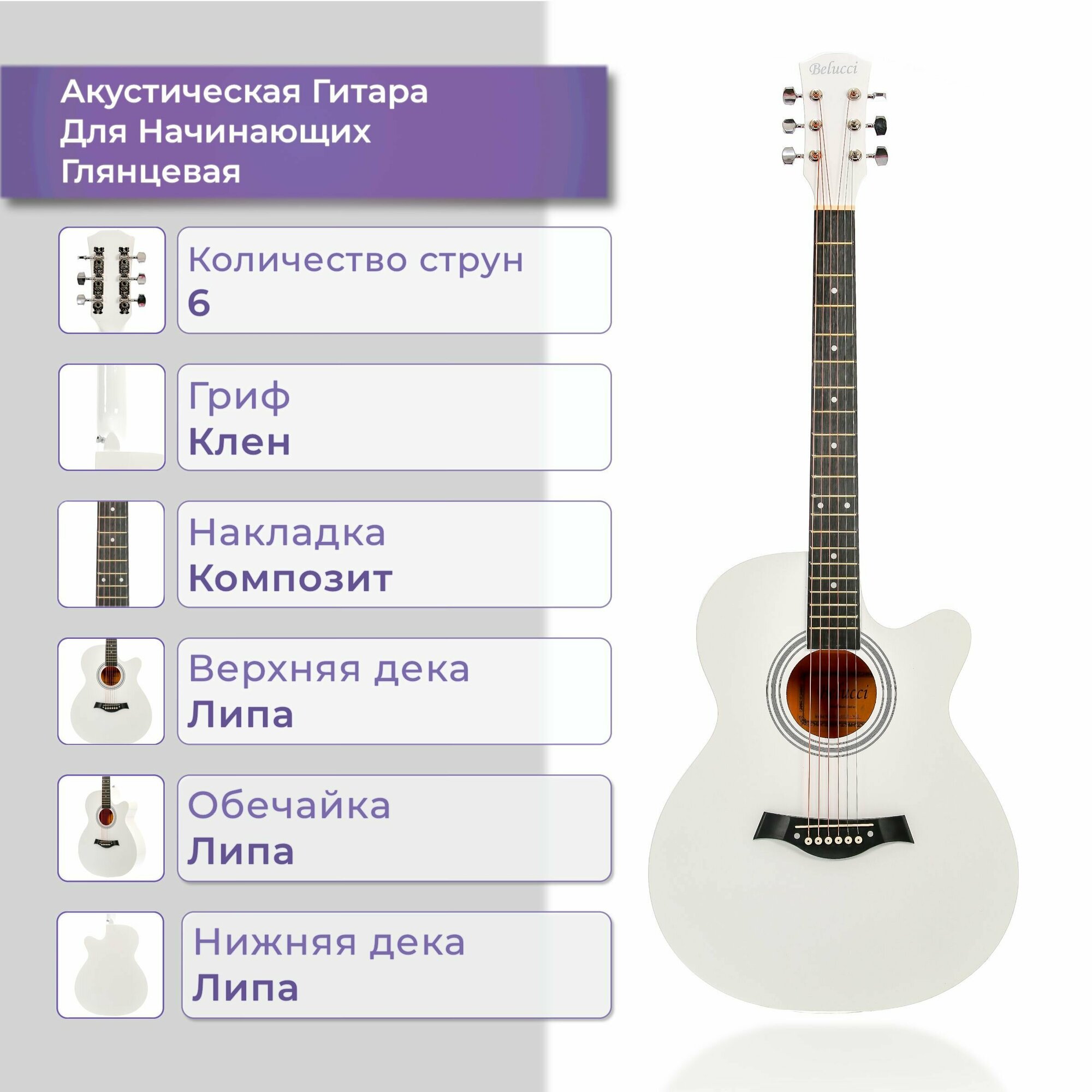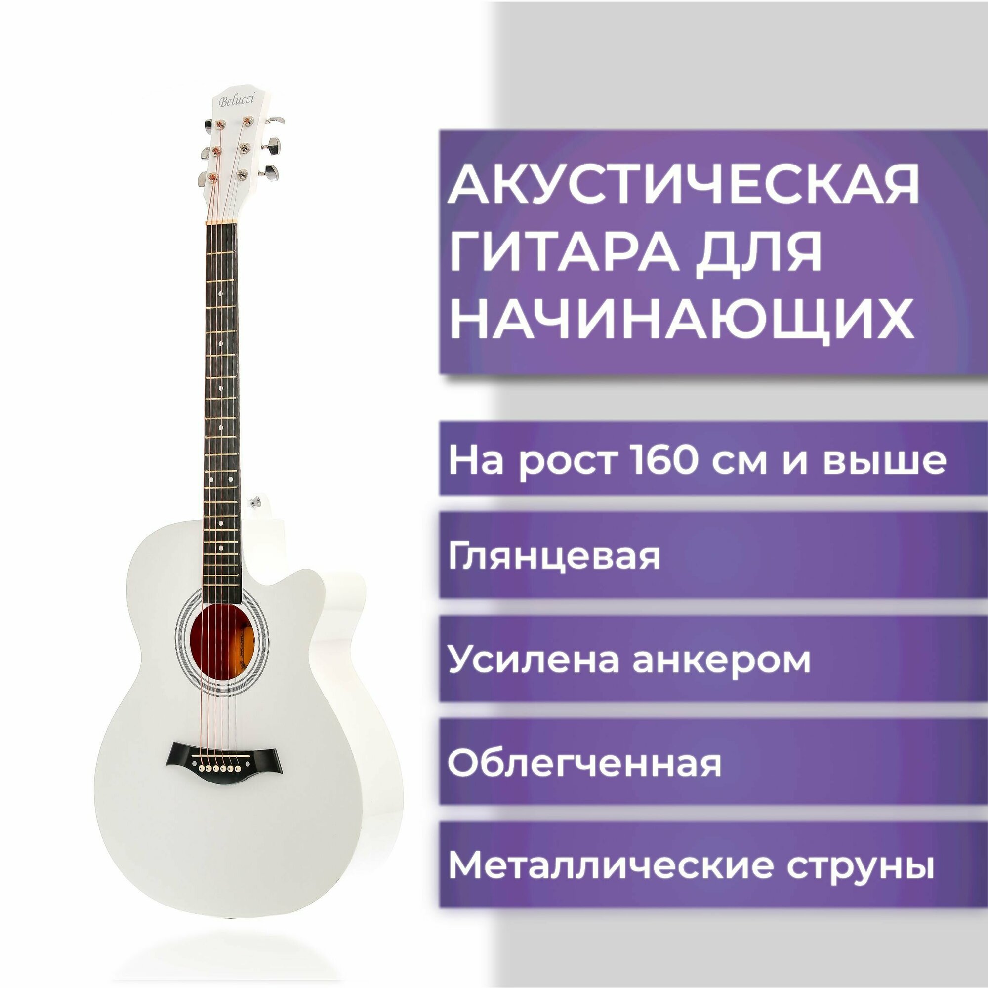 Гитара акустическая для начинающих Belucci шестиструнная с металлическими струнами и анкером. Размер 40 дюймов. Белуччи BC4010 WH