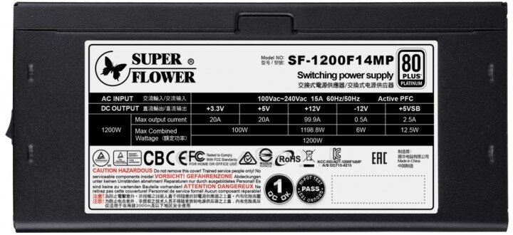 | Подробная комплектация | блок питания Super Flower Leadex SE Platinum 1200W, чехол для кабелей, комплект винтов; кабели: 1x20+4Pin(600 мм), 2xCPU((4+4Pin)750 мм), 4xPCI-E 6+2Pin(750 мм), 2xSLI(2xPCI 6+2Pin(750+150 мм)), 4x3SATA(550+100+100 мм), 1x3Molex(550+100+100 мм), 1x2Molex + 1FDD(550+100+100 мм), 1xсетевой кабель; документация |