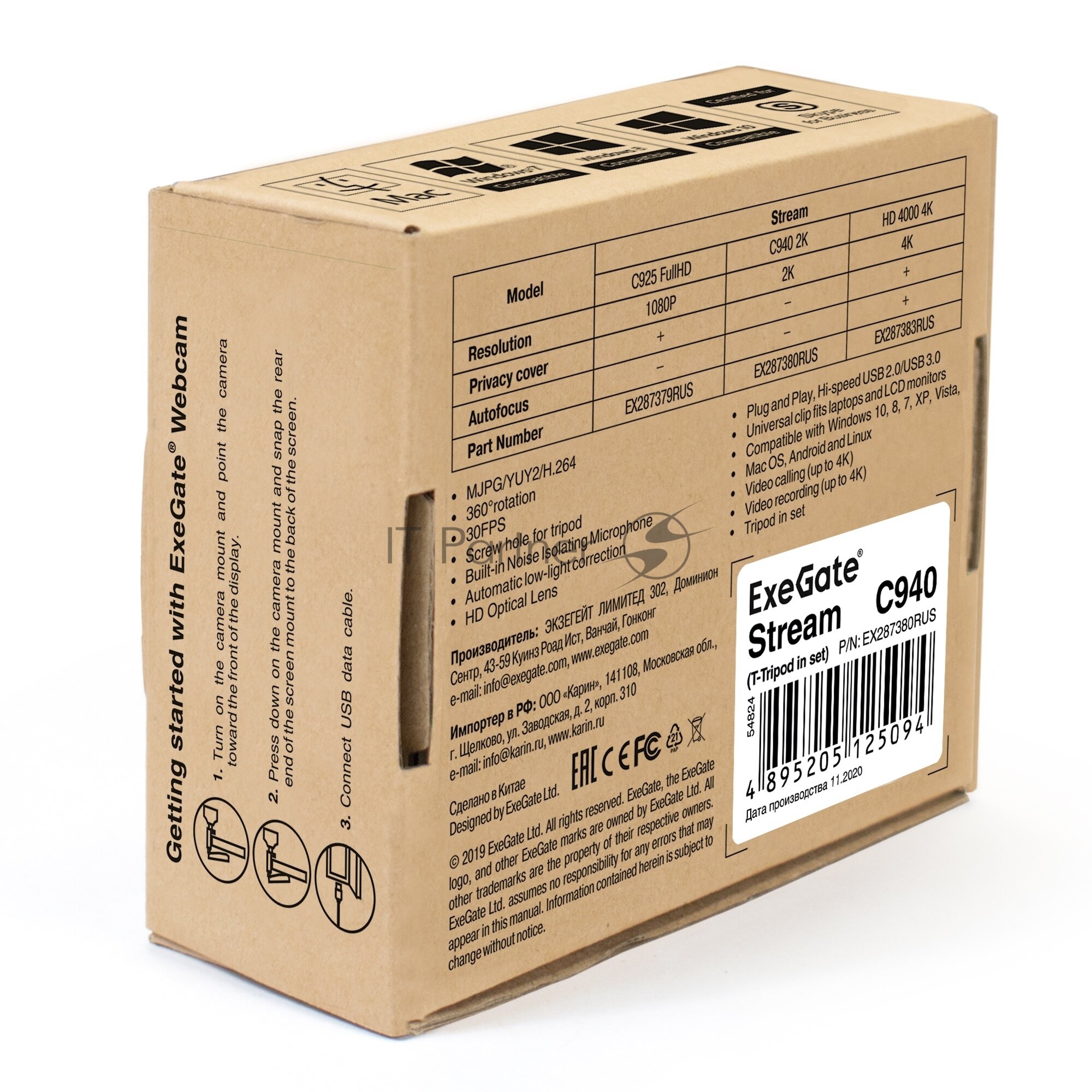 EXEGATE веб камеры EX287380RUS Веб-камера Stream C940 2K T-Tripod матрица 1 3" 5Мп, 2560x1440, 30fps, 4-линзовый объектив, ручной фокус, USB,