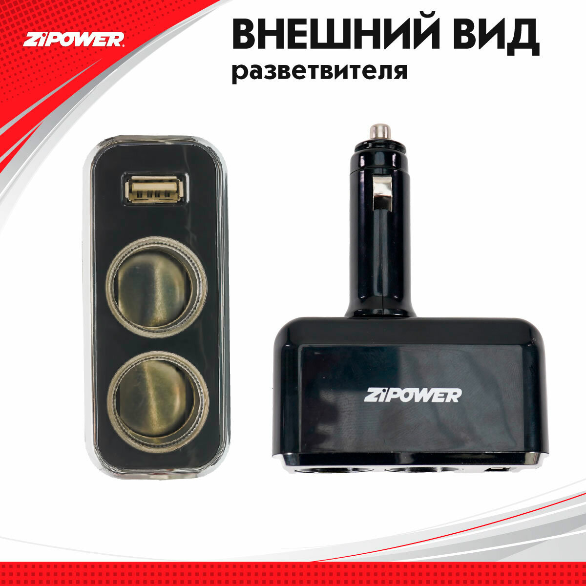 Разветвитель в прикуриватель ZIPOWER 2 гнезда + 1 USB, 12/24 В, 120 Вт