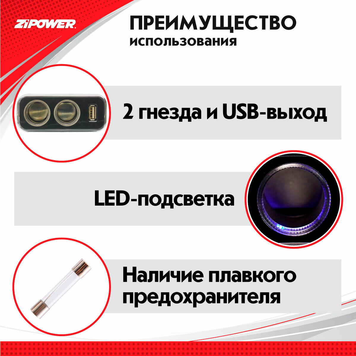 Разветвитель Прикуривателя На 2 Гнезда + 1 Usb 1а Zipower Pm6645 ZiPOWER арт. PM6645