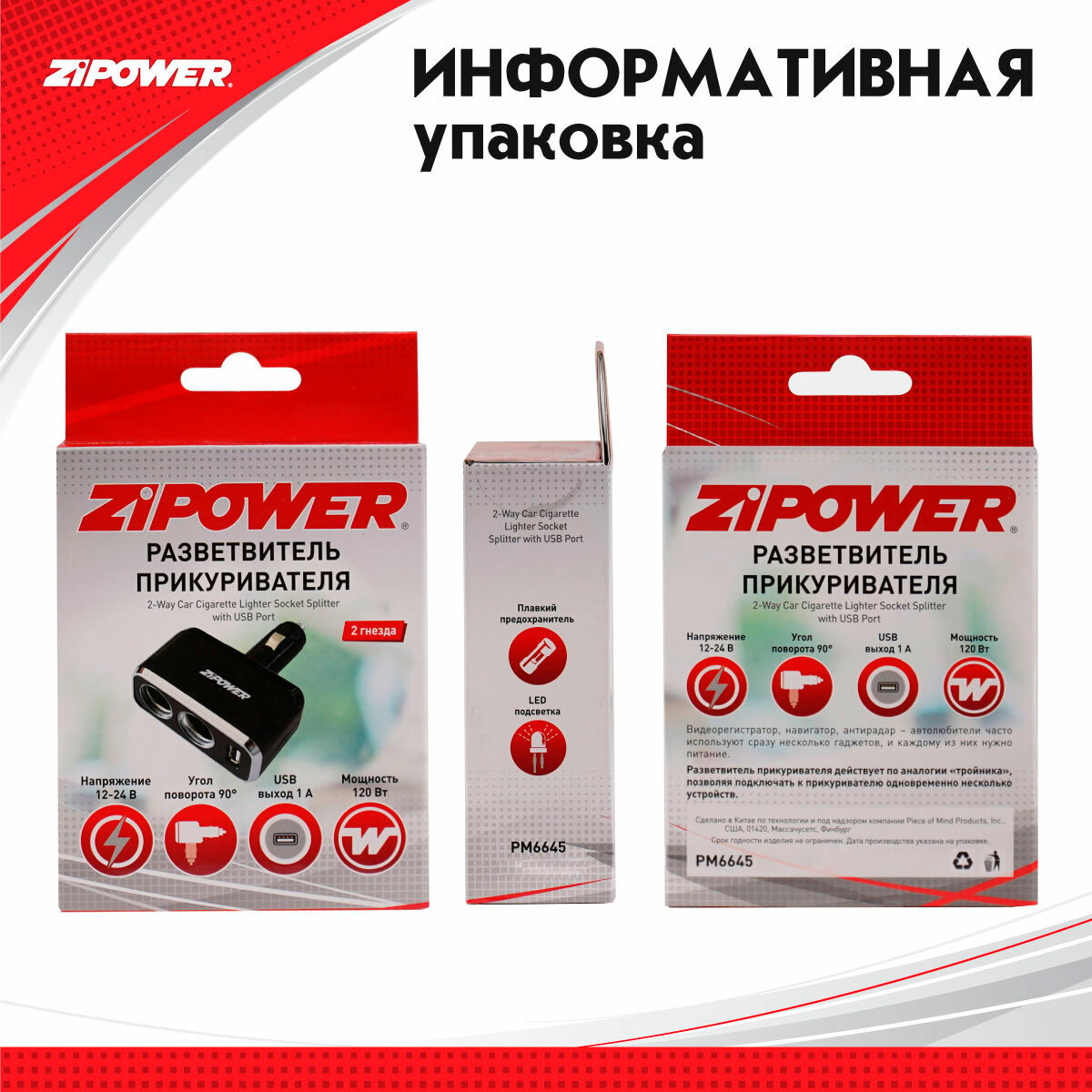 Разветвитель в прикуриватель ZIPOWER (2 гнезда+1 USB, 12/24В, 120Вт, LED подсветка, плав.предохр., ZIPOWER PM6645