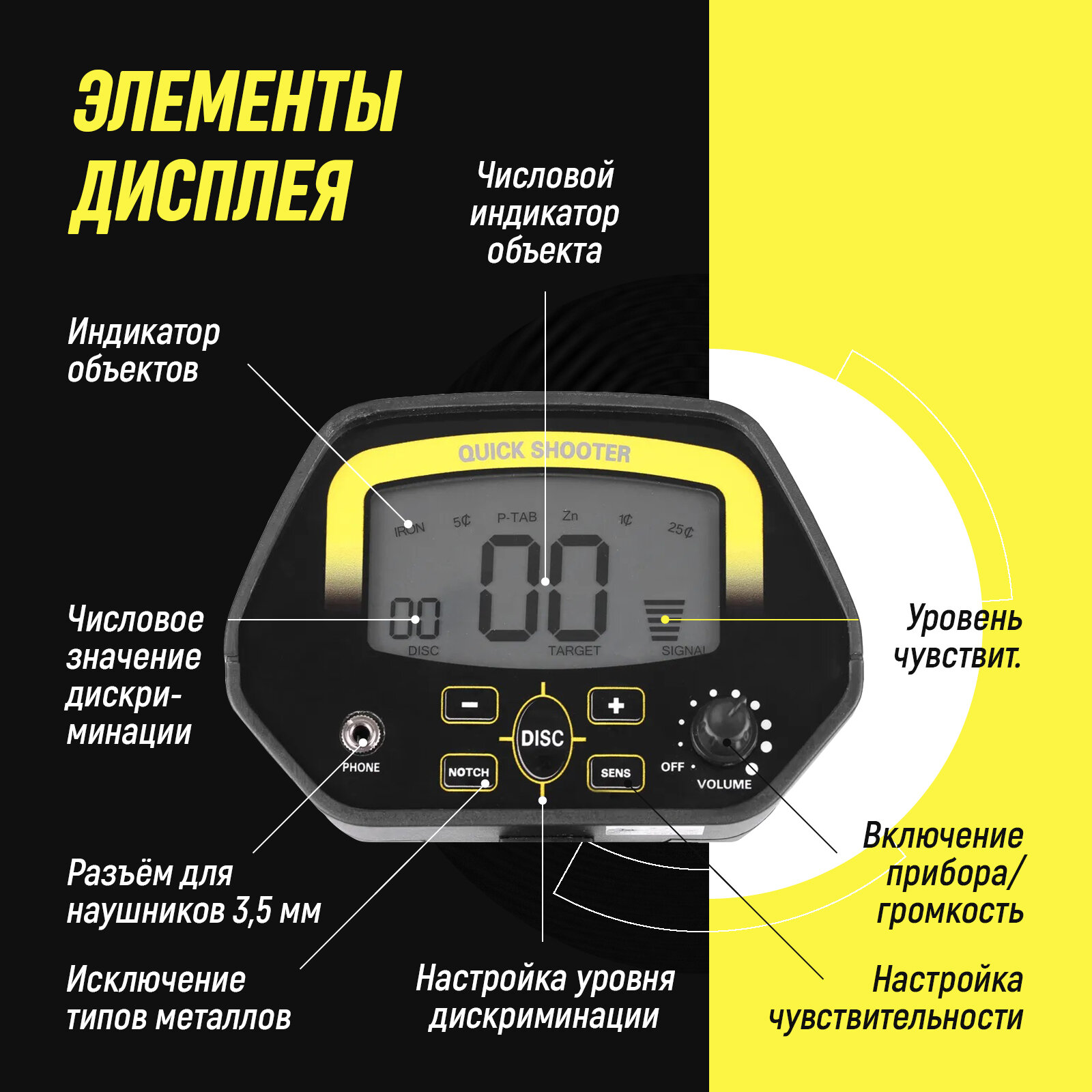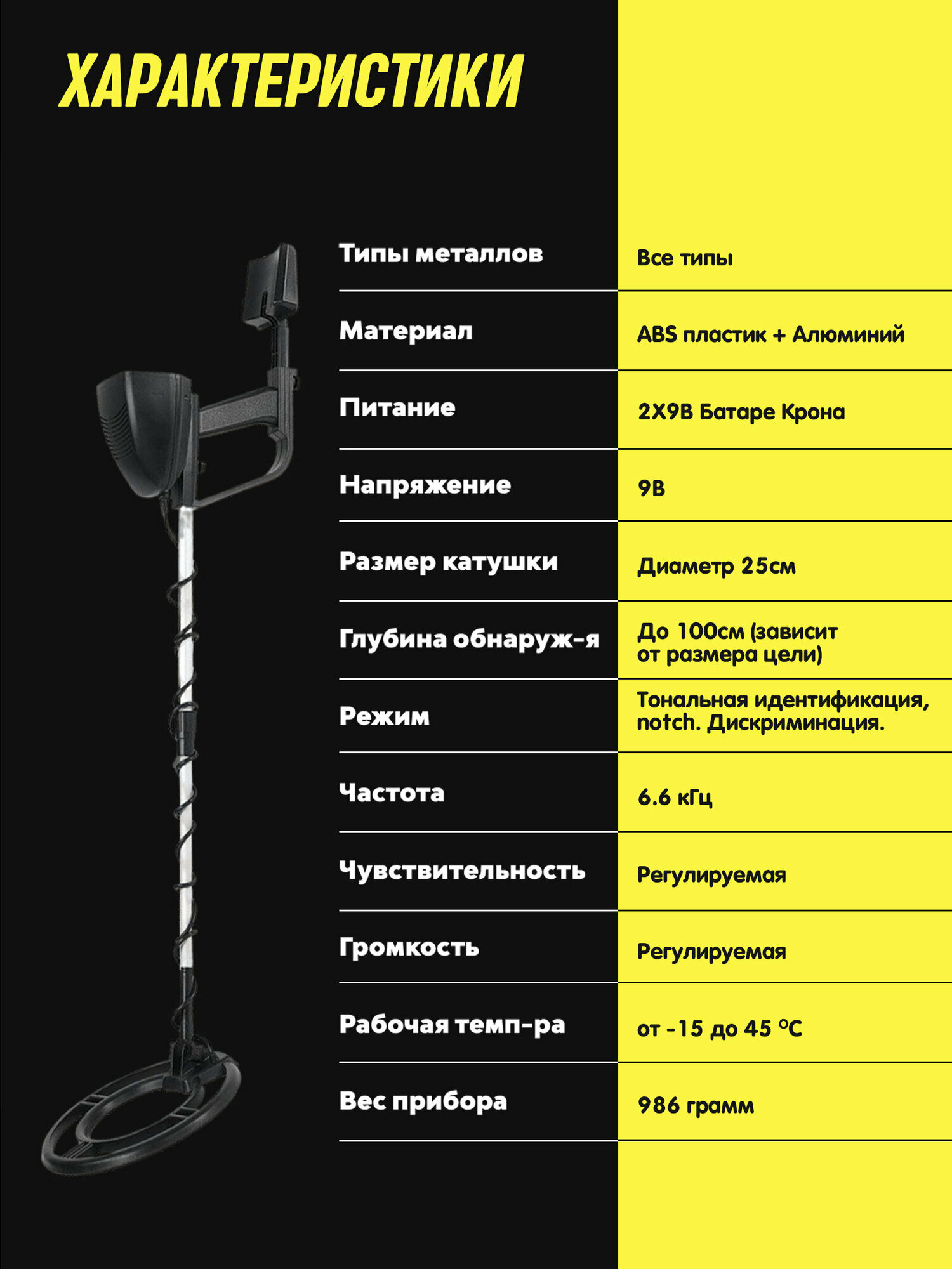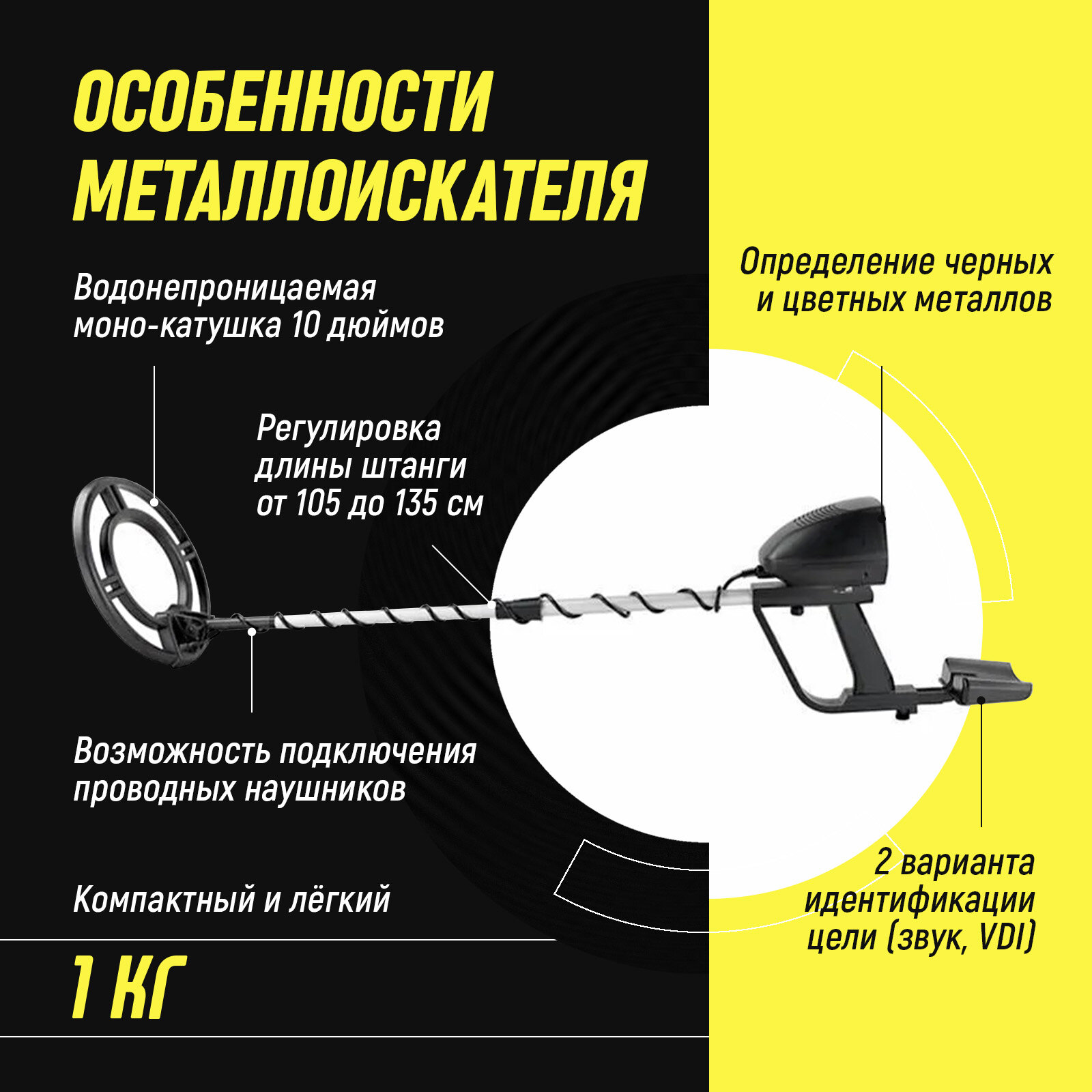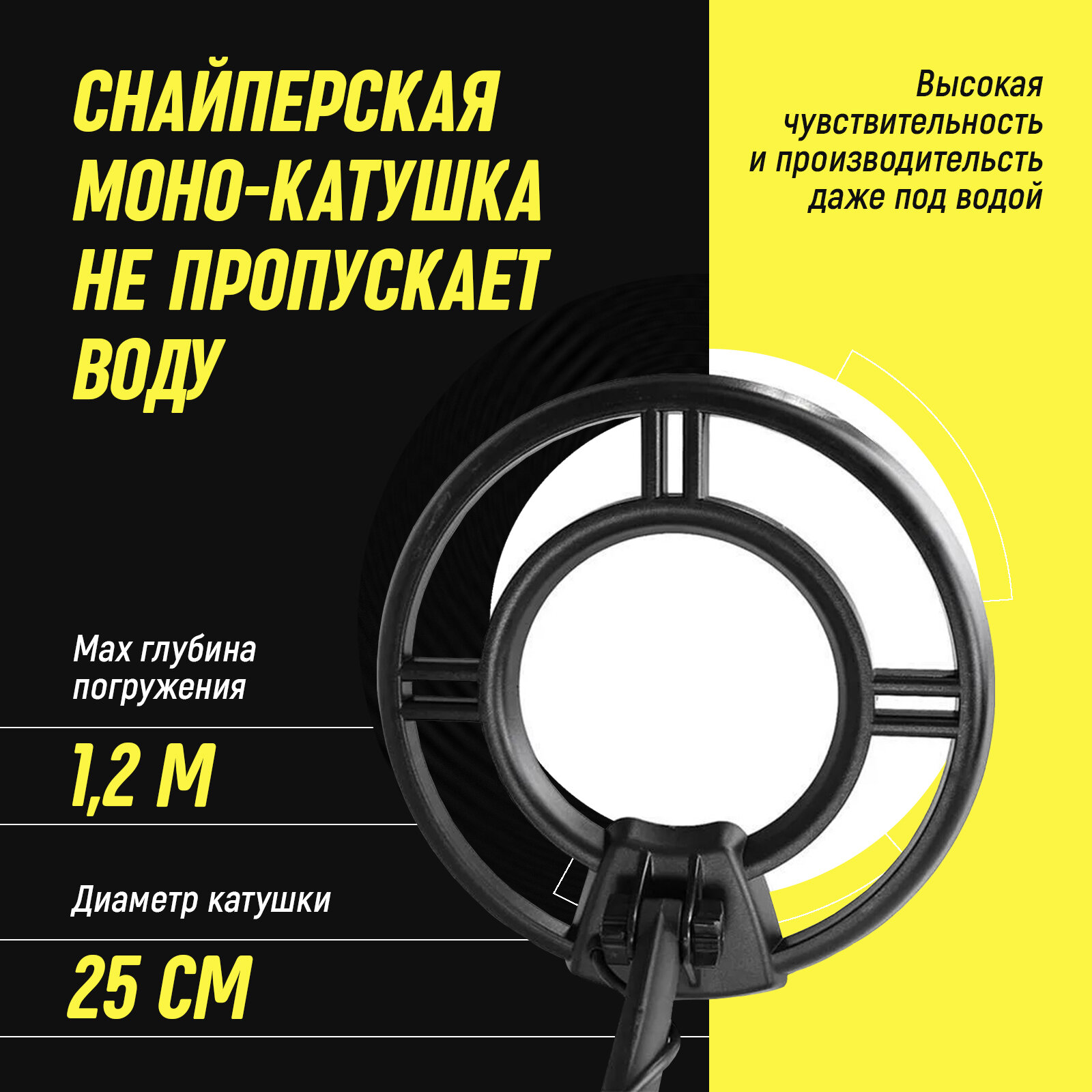 | Особенности | влагозащита катушки/рамки / выход на наушники / дискриминатор / подлокотник |
