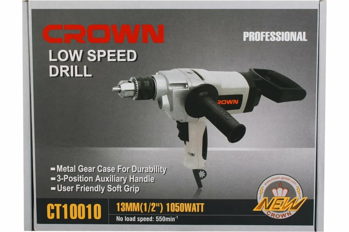 Дрель безударная CROWN CT10010 (1050Вт, патрон 16мм, 550об/мин, 3,2кг, коробка) professional
