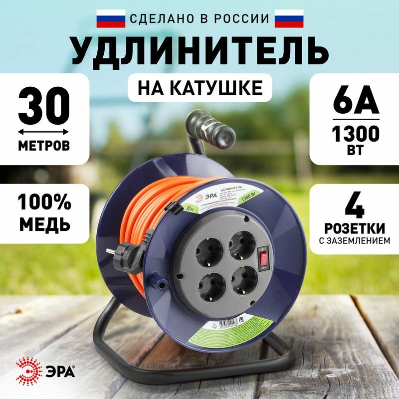 Удлинитель строительный силовой Эра RPx-4es-3х0.75-30m на катушке с заземлением и выключателем 30 метров 4 розетки 6А