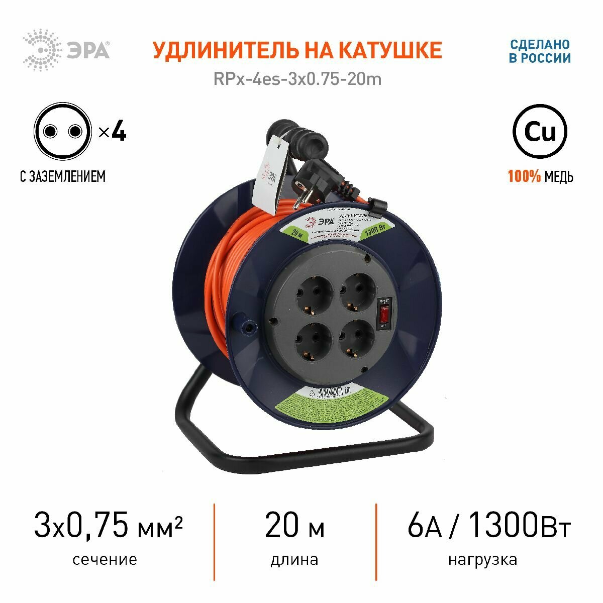 Удлинитель строительный силовой Эра RPx-4es-3х0.75-30m на катушке с заземлением и выключателем 30 метров 4 розетки 6А