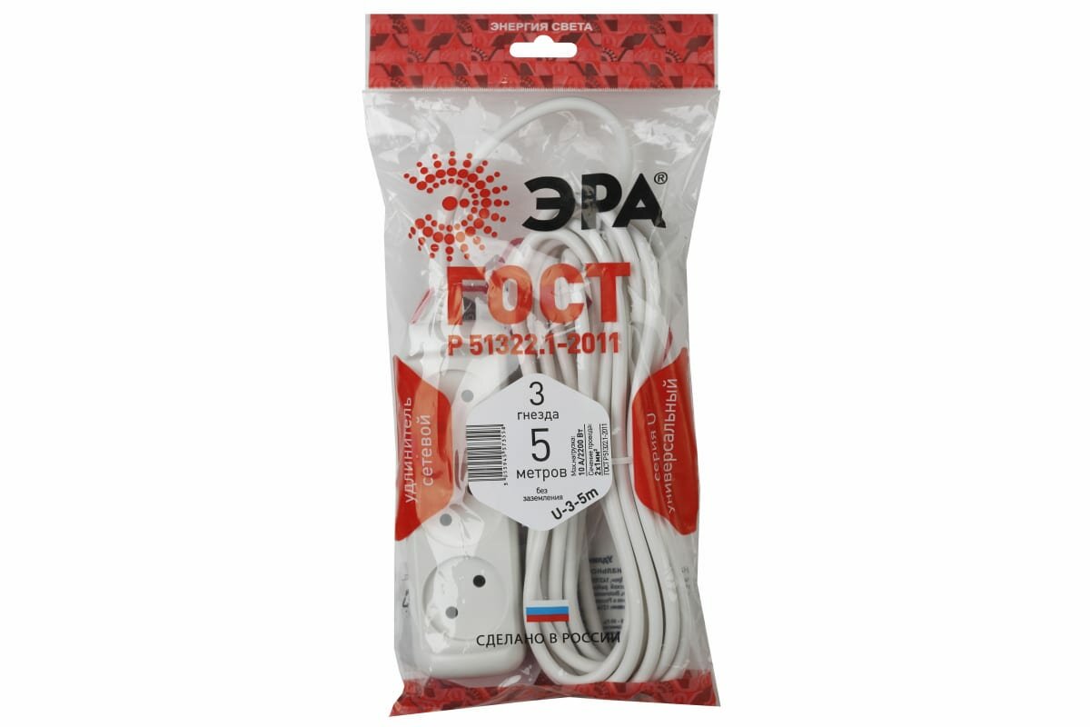 Купить ЭРА U-3-5m ЭРА Удлин-ль без зазeмл., 3гн, 5м, ПВС, 2х1мм2, 10А (20/720)