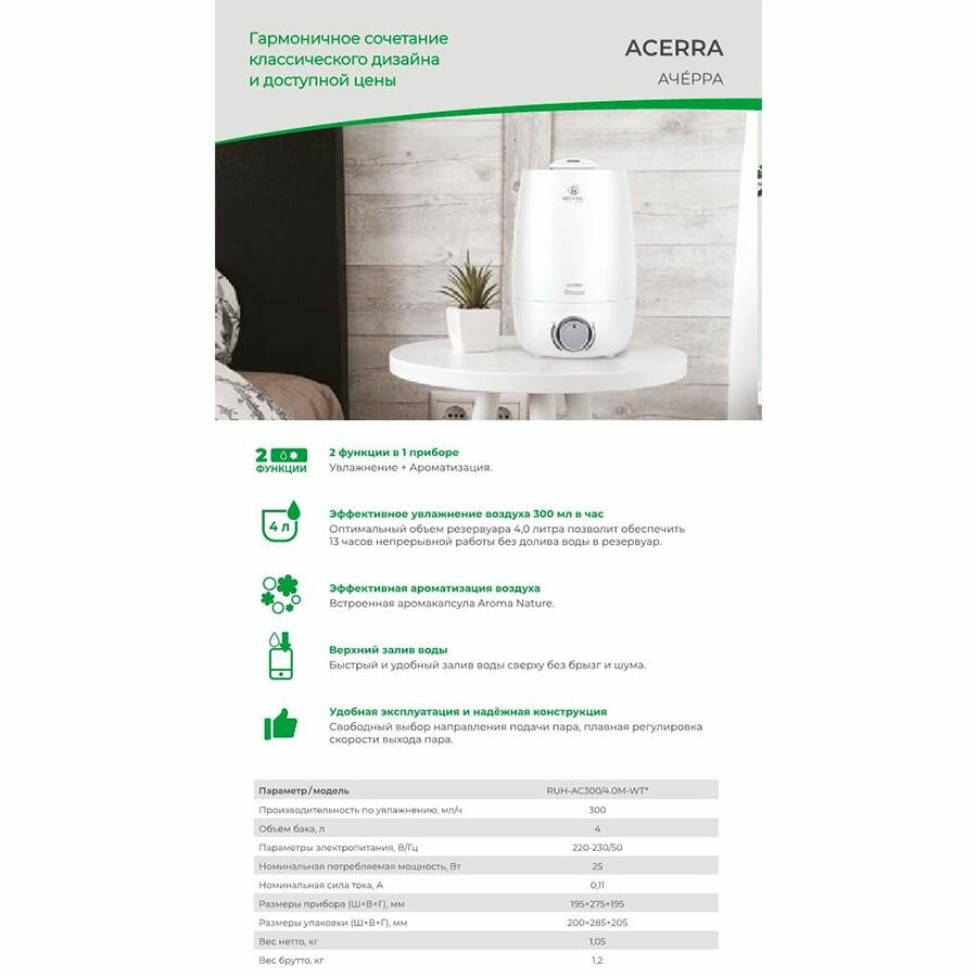 Увлажнитель воздуха ультразвуковой ACERRA, RUH-AC300/4.0M-WT, белый интересное: