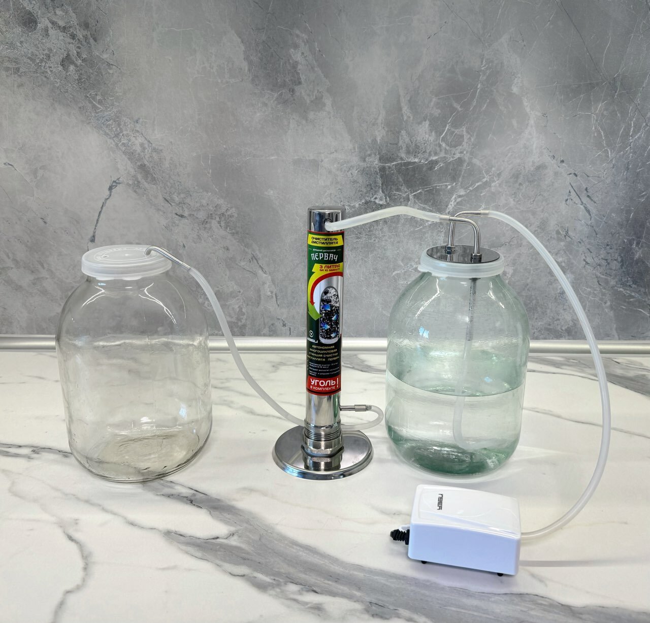 | Подробная комплектация | - Разборная колонна из нержавеющей стали для загрузки угля - Электрический компрессор - Комплект силиконовых трубок с крышками, подходящими для стандартных стеклянных банок - Активированный уголь для первой очистки - Инструкция пользователя |