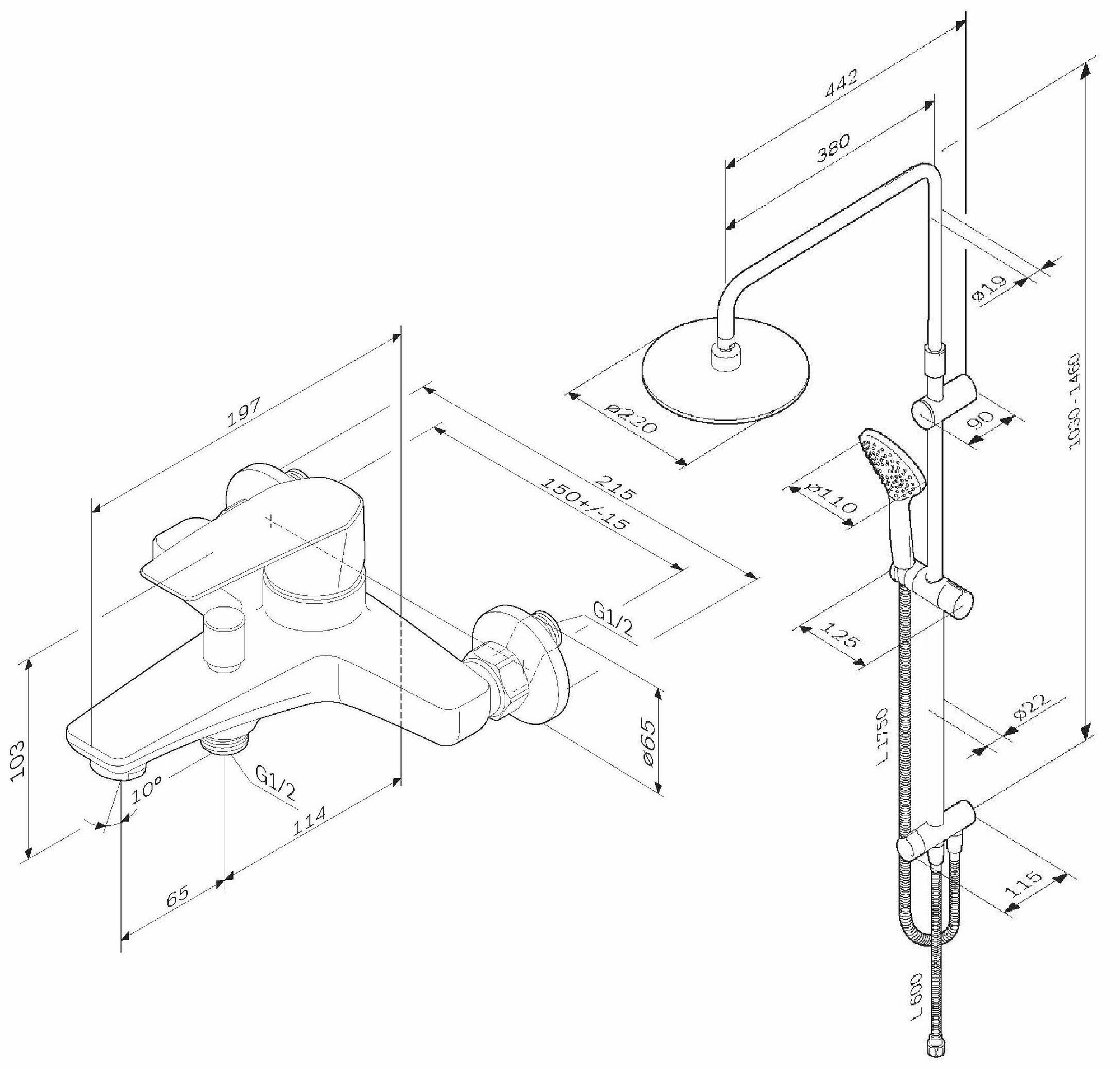 | Высота стойки для душа | 103 мм / 1030 мм |