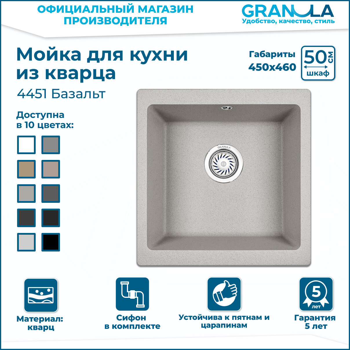 Мойка для кухни врезная кварц GRANULA 46x45x20 Кухонная раковина в комплекте с сифоном. Цвет черный