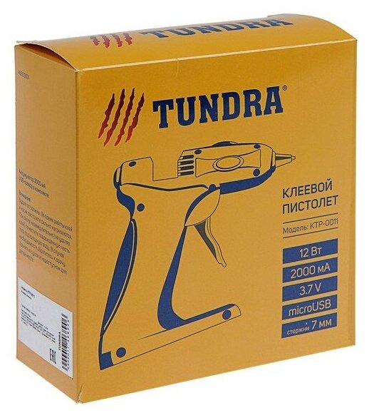 Клеевой пистолет Tundra 12 Вт, аккумулятор 2000 мА, microUSB, 7 мм