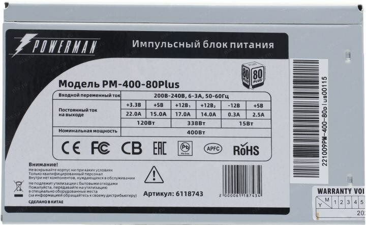 Блок питания 400 Вт ATX POWERMAN PM-400 80Plus, 120 мм, 80 Plus (6118743)