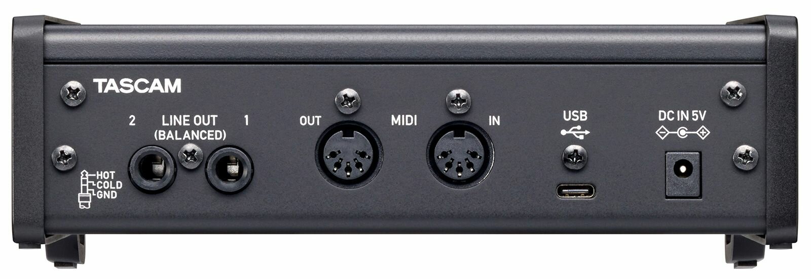 Tascam US-2x2HR USB аудио интерфейс, 24 бит/192 кГц, 2x Combo XLR/TRS микр./лин./инстр. входа, питание +48 В, 2х 1/4" TRS лин. выхода, 1/4" стерео выход на наушники, USB 2.0 Type-C (питание), MIDI In/Out, разъем DC 5V, совместимость Win/MacOS X