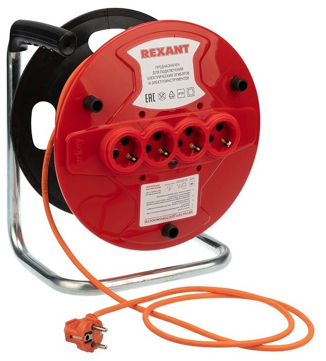 Удлинитель-шнур на катушке REXANT ПВС 3х1.0, 20 м, 4 гнезда, с/з, 10 А, 2200 Вт, IP20, оранжевый (Сделано в России) интересное: