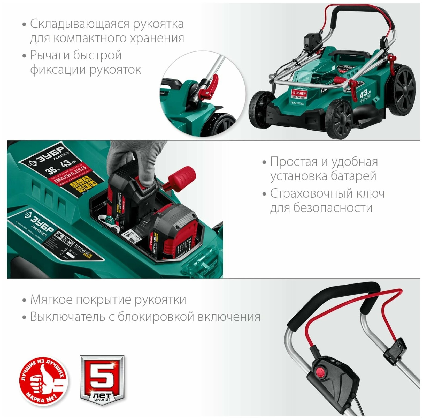 Бесщёточная аккумуляторная газонокосилка 2х18В АКБ Зубр ГКЛ-3736-42