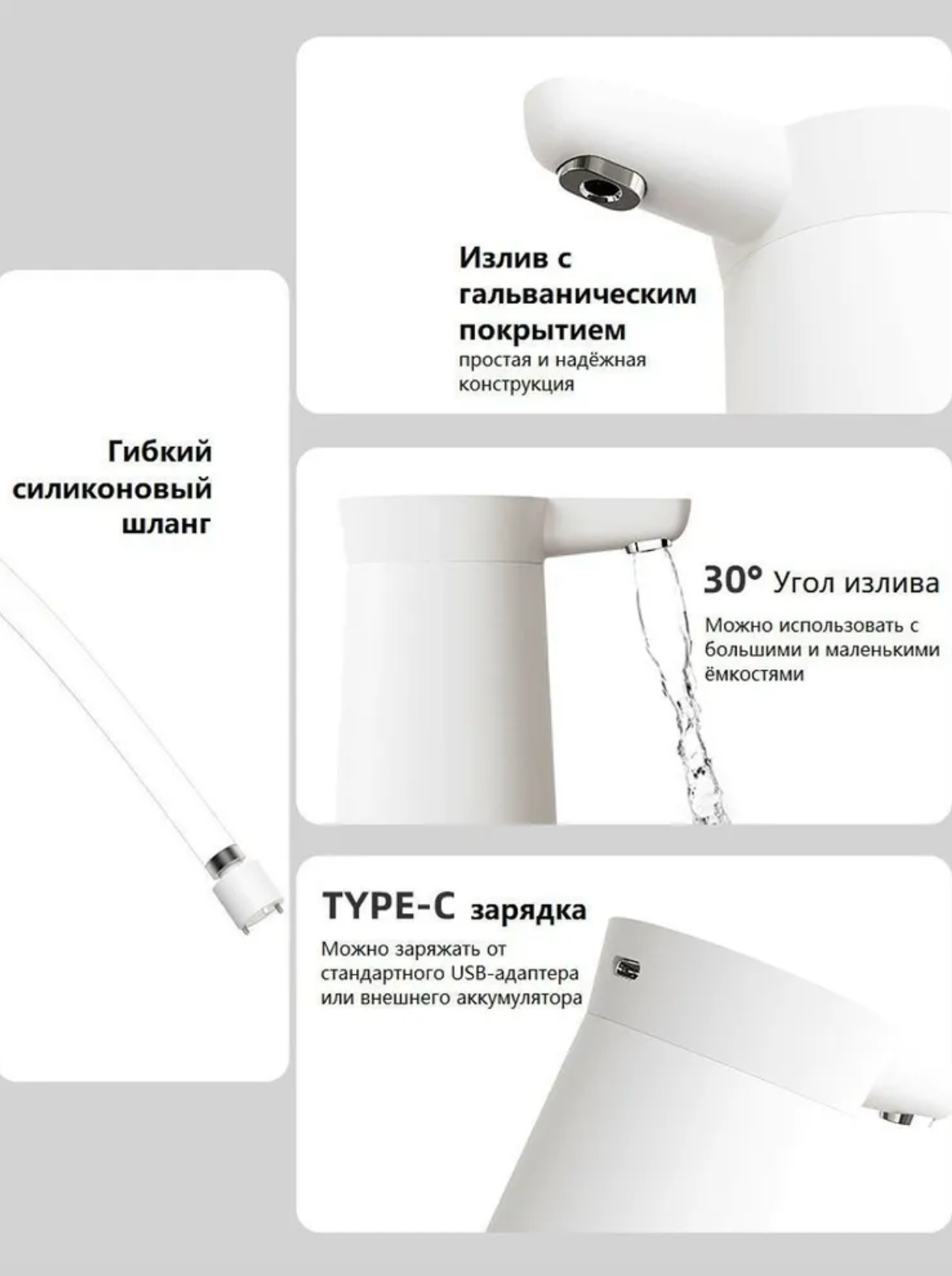 | Плюсы: | Долго держит зарядку, приятный внешний вид,зарядка type-c,легко устанавливать, шланг длинный достает до самого дна 20л бутыля. |