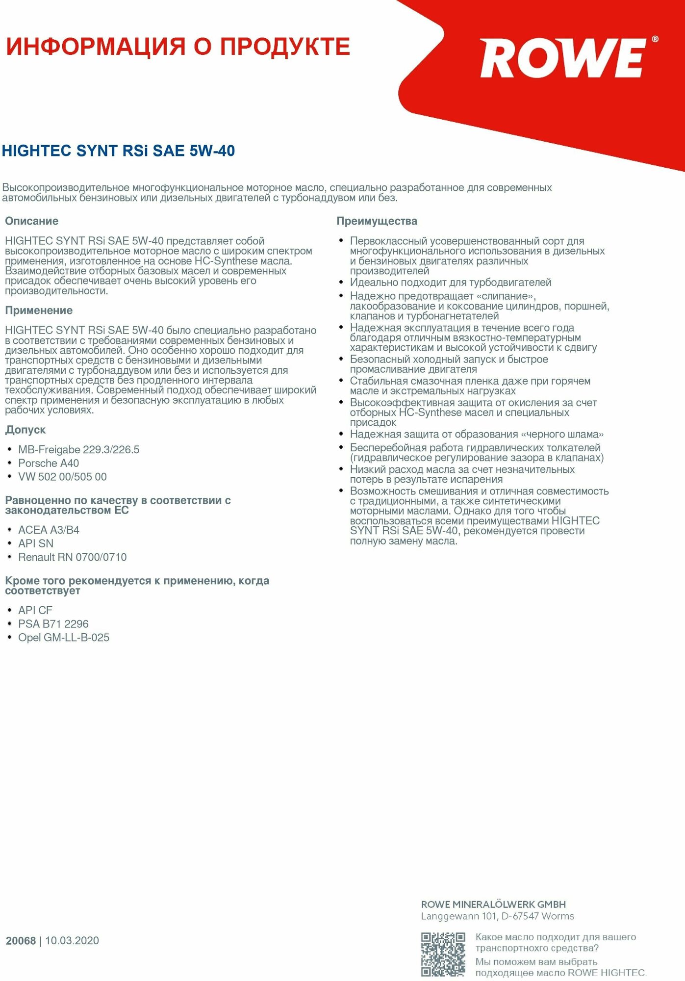 rowe hightec synt rsi sae 5w-40 (4 л.)acea a3/b4 api sn/cf rn 0700/0710 vw 502 00/505 00