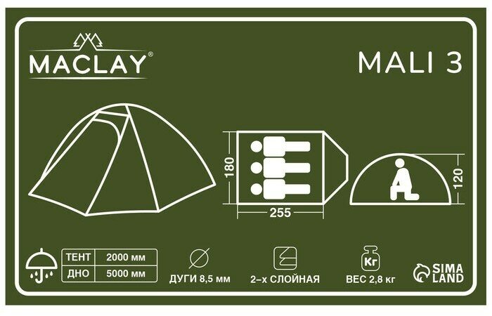 Палатка туристическая Mali 3, размер 255 х 180 х 120 см, 3-местная, двухслойная Maclay 5385297 .