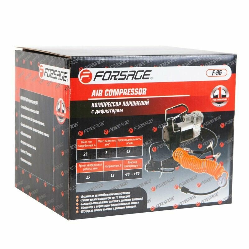 Компрессор поршневой автомобильный с витым шлангом F-95 "FORSAGE"(45л/мин, 23А) 12V(питание от прикуривателя) Forsage F-95