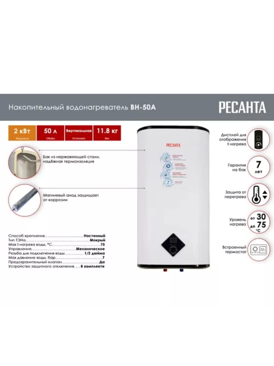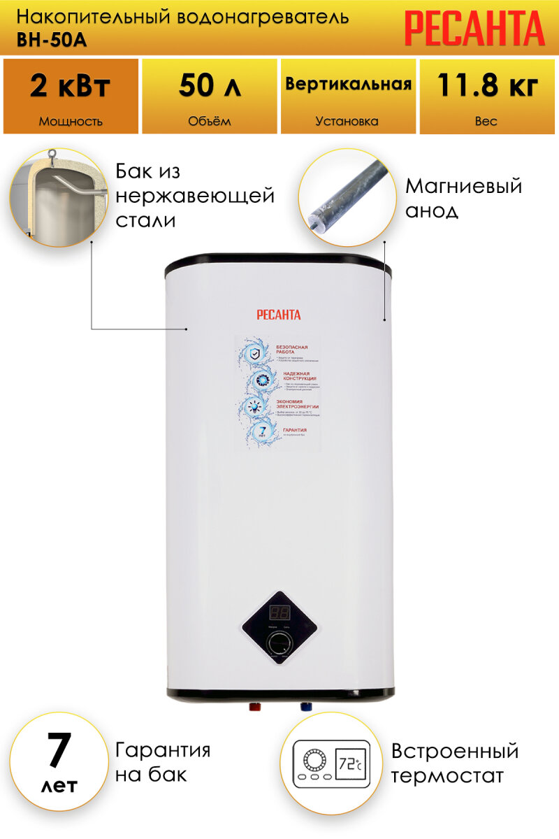 Водонагреватель накопительный ВН-50А Ресанта, арт. 74/5/14