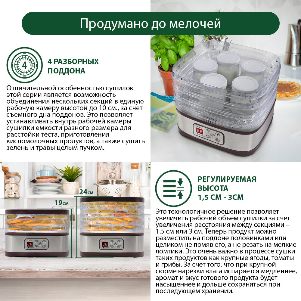 | Плюсы: | Вместительная сушилка с семью поддонами для фруктов и овощей. |