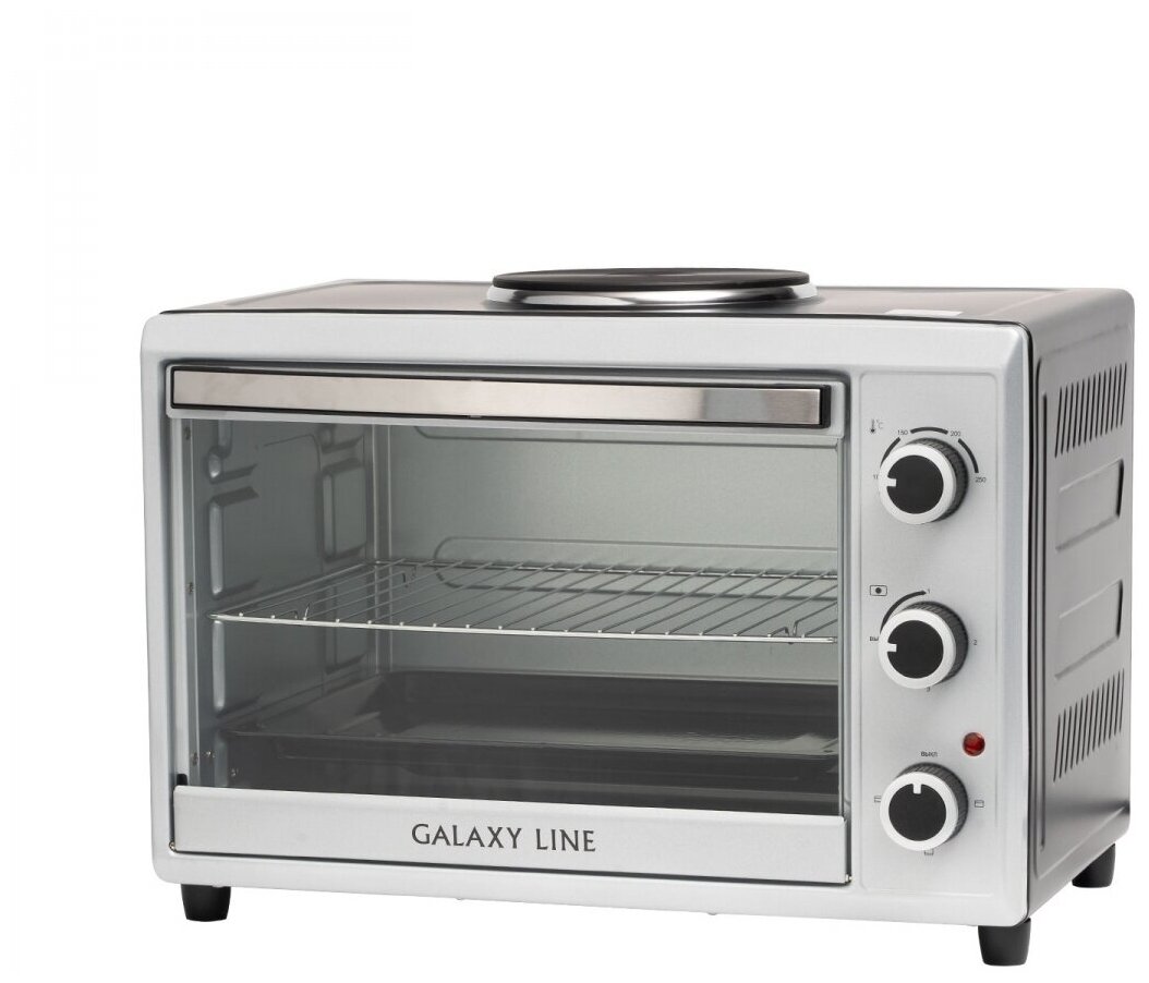 GALAXY LINE GL 2602 Мини-печь с одной конфоркой, объем 38л, 3000 Вт (мощность духовки 2000 Вт, мощность конфорки 1000 Вт), диаметр конфорки 185 мм ,3 режима работы духовки, дверца из жаропрочного стекла, регулировка температуры духовки от 100 °С до 250 °С