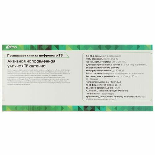 ТВ-антенна RITMIX RTA-355-42 AVS, активная, уличная,усиление до 30-42 дБ, хороший приём до 50км от ТВ вышки, FM/VHF/UHF, 87.5-108 MHz, 470-860 MHz (1/
