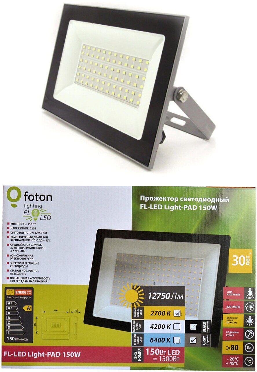 Светодиодный прожектор Foton Lighting 150Вт 220В 2700К Теплый белый 12750Лм IP65 серый 290x210x30мм 1020г, упаковка 1шт