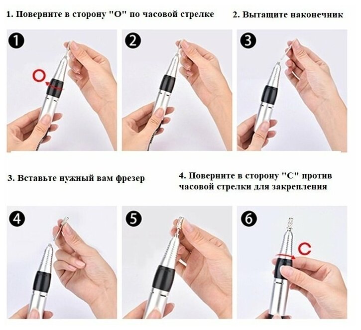 Аппарат работает. Есть инструкция, но она на китайском, фрезы меняются без проблем. Все ок. Пользовалась пока 1 раз, посмотрим насколько хватит. Единственное-коробочка где фрезы с трещиной, выкинула сразу ее.