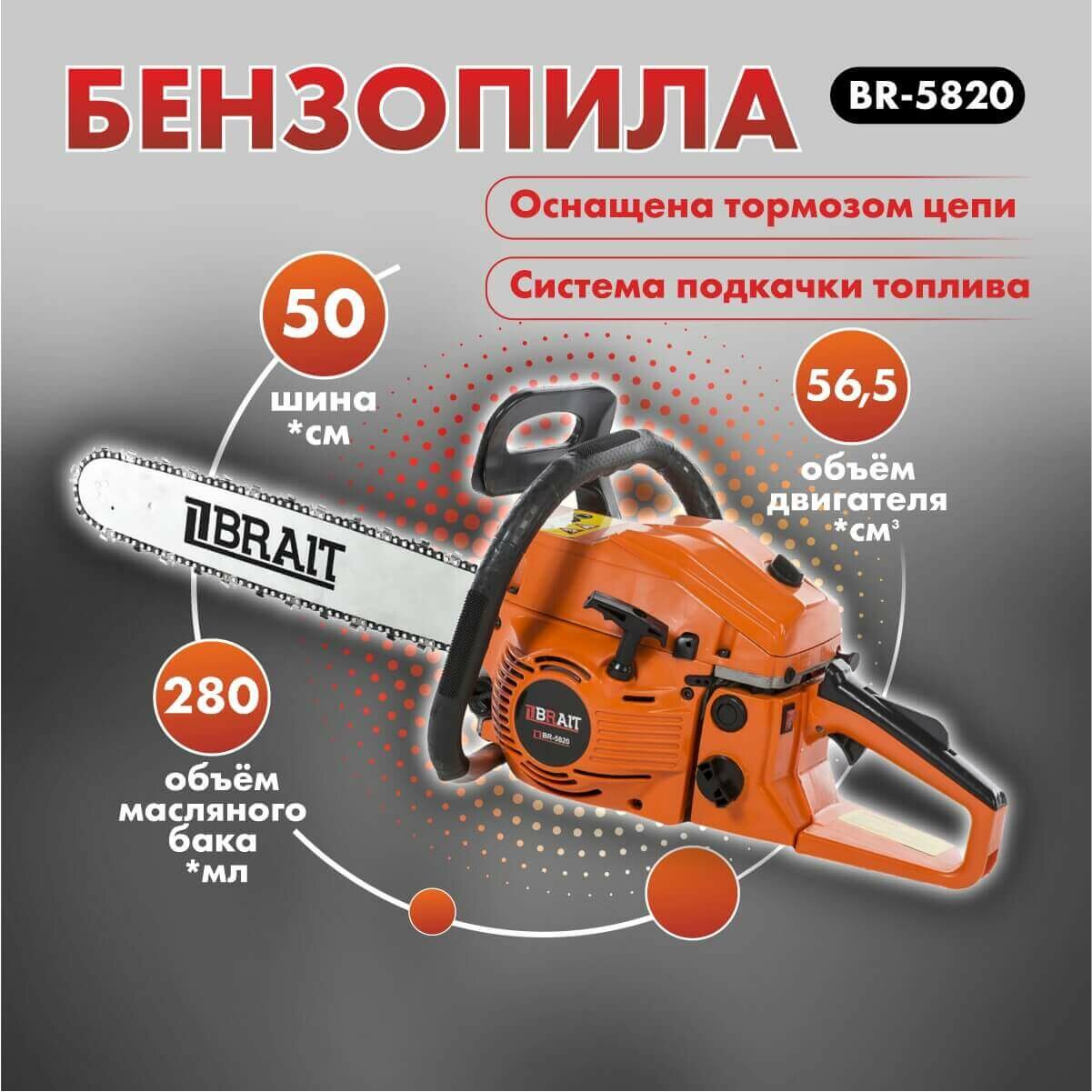 Бензопила цепная бензиновая BRAIT BR 5820 / пила садовая для дров, для дачи (шина 50 см, мощность 2400 Вт)