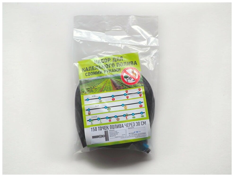| Комплектация | 1. Лента капельная с шагом 30 см – 50м. 2. Фитинг стартовый -5 шт. 3. Соединение ремонтное – 1 шт. 4. Манжета для пластиковой трубы – 5шт. |
