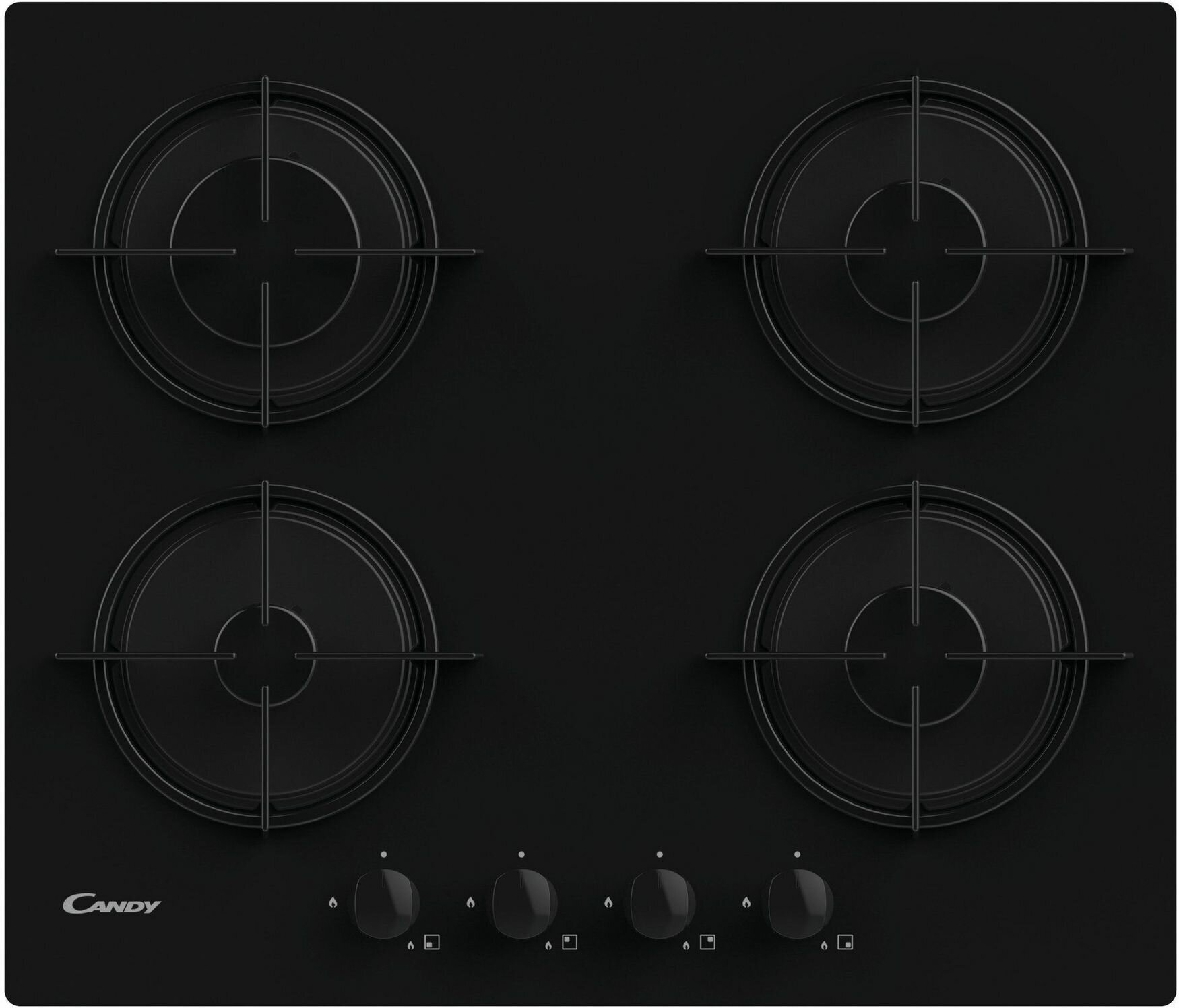 Варочная панель Candy Газ на стекле. 60 сантиметров. Цвет: Черный. Ручки: Smart. Газ-контроль. Автоматический электроподжиг. 4 конфорки: быстрая