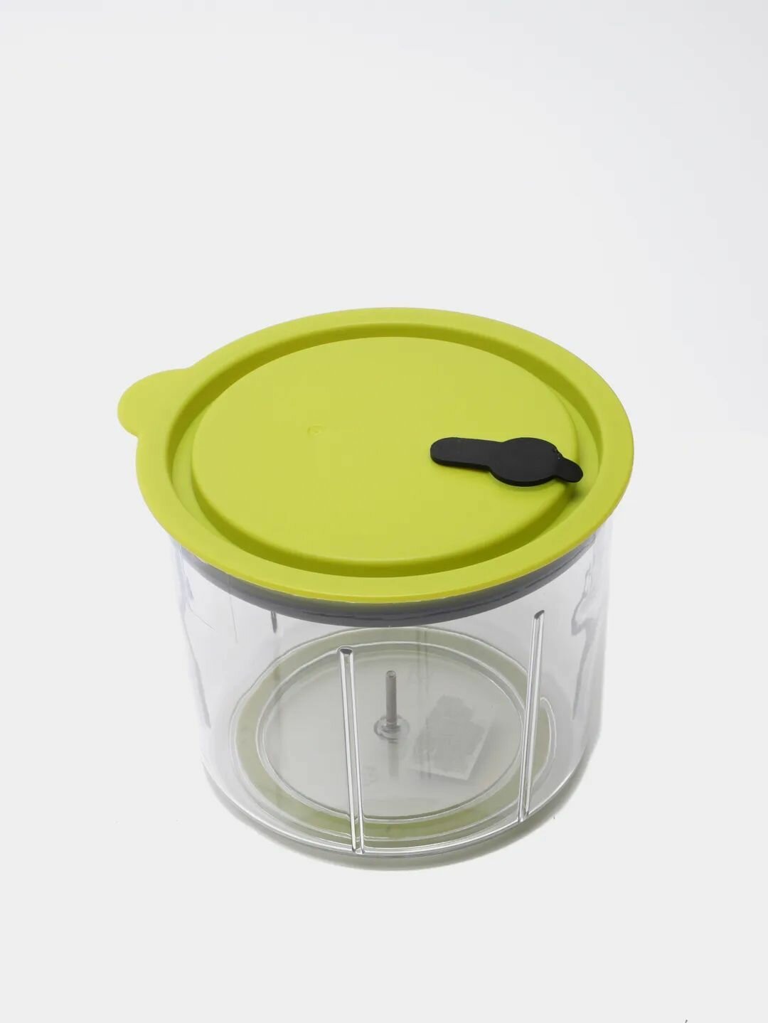 | Дополнительная информация | Руководство по эксплуатации прибора: 1) Установите контейнер на устойчивую ровную поверхность, поместите внутрь режущие лезвия. 2) Поместите продукты внутрь контейнера, установите сверху крышку и ручку. 3) Переместите регулятор блокировки ручки влево, придерживая при этом ручку. 4) Нажимая на ручку, измельчите продукты. Для взбивания / перемешивания теста, установите вместо ножей насадку для взбивания. |