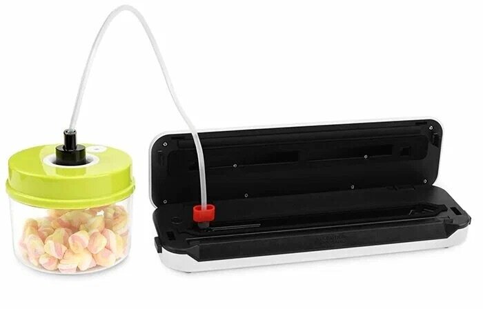 | Плюсы: | Быстро работает. Есть режим. Для сухих и для влажных продуктов. Работает по-разному. В комплекте пробка для вакуумизации бутылки. Как-нибудь испытаем. Удобно отрезать пакет верхним ножом. |