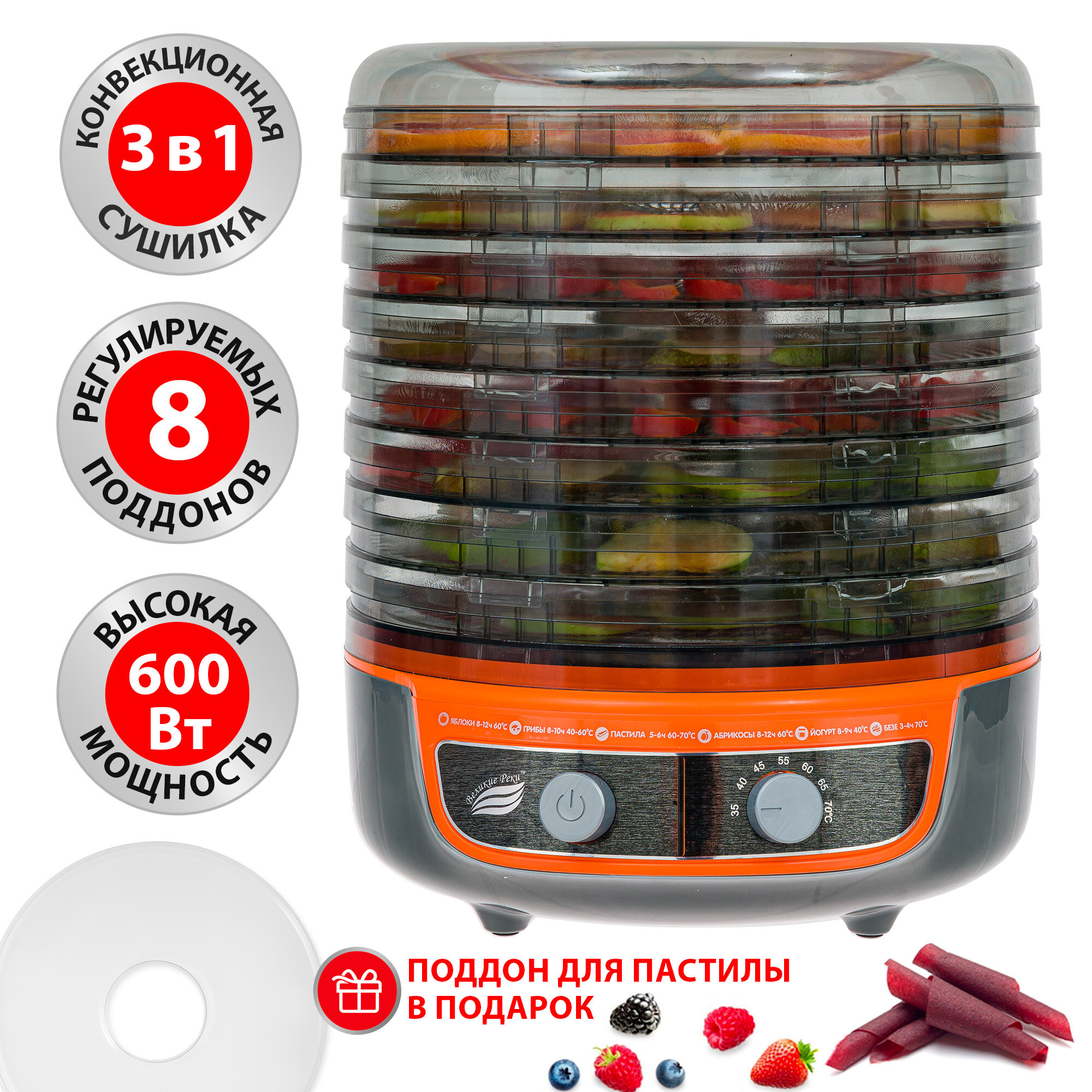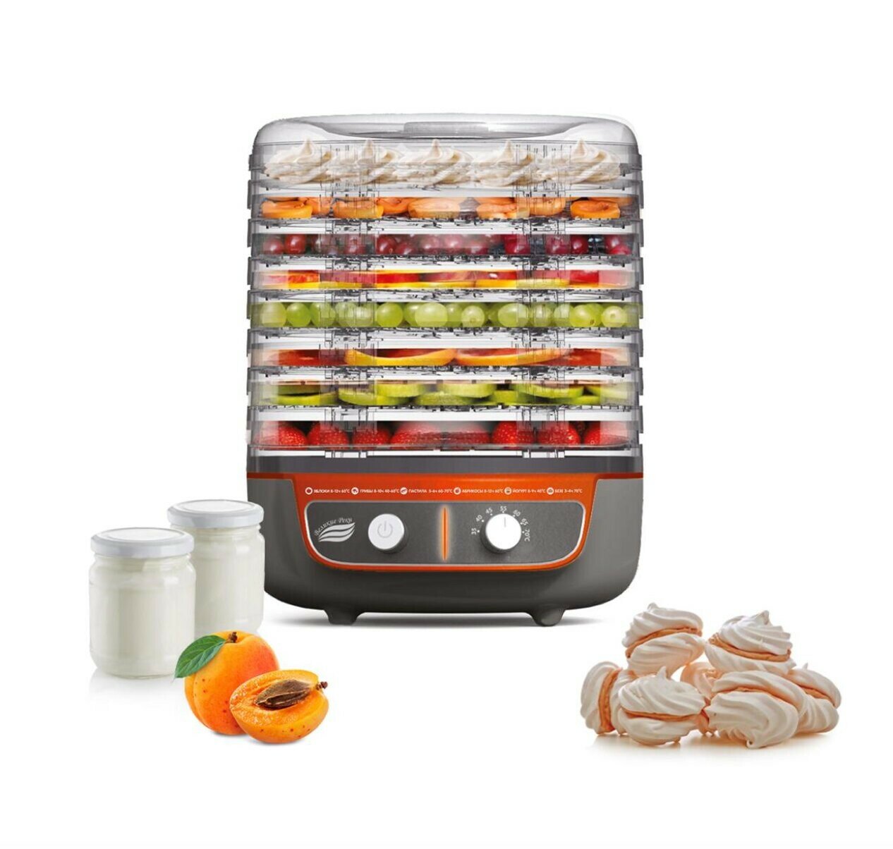 Сушилка для овощей 3в1 с функциями приготовления йогурта и десертов + поддон для пастилы в подарок Великие Реки Волга-9 серо-оранжевая