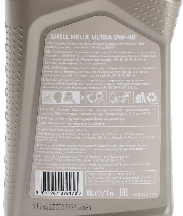 Синтетическое моторное масло SHELL Helix Ultra 0W-40, 1 л, 1 кг