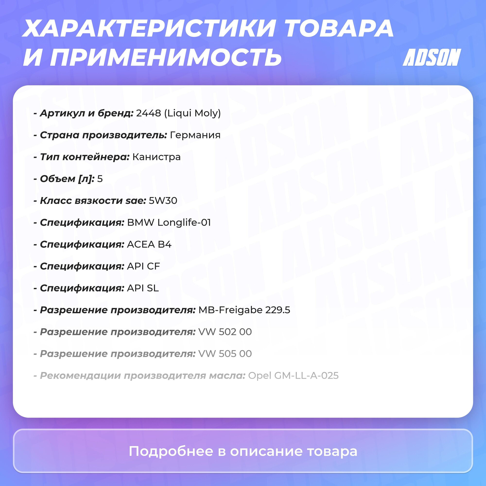 | Плюсы: | Рекомендуется для широкого спектра автомобилей с высочайшими требованиями к свойствам моторного масла, таких как Mercedes-Benz, BMW, VW, Opel.