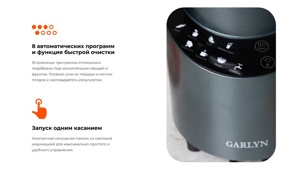 Сама соковыжималка можно сказать компактная и слишком много места не занимает. Дизайн очень приятный, современный. Такой будет гармонично смотреться абсолютно на любой кухне. Всё стильно и лаконично. Стоит на поверхности она устойчиво. Из минусов отмечу шнур питания. Хотелось чтобы он был длиннее. Но это субъективно конечно. Просто у меня розетка для приборов неудачно расположена. Управление у этой соковыжималки сенсорное. Оно очень простое и удобное. Всё здесь можно сказать интуитивно понятно. Большой плюс за очень широкую горловина для плодов. Почти все овощи и фрукты можно целиком засовывать не тратя лишнее время на их резку. Уровень шума во время работы достаточно комфортный. Совсем бесшумной её естественно не назовёшь, но по сравнению с моими предыдущими соковыжималками она очень тихая. Моется после использования легко. Это тоже её большой плюс. Я например своими старыми соковыжималками редко пользовалась именно из-за того, что неохота было возиться потом с мойкой. Стакан сока делаешь за пару минут, выпиваешь его и потом минут 10-15 разбираешься и моешь соковыжималку. Не стоит оно того. Эта же модель от GARLYN тем и хороша, что всё делается очень быстро. В том числе и мойка. Ну и самое главное конечно, за что я и полюбил её, это то, как она работает. В ней заложено 8 автоматических программ под самые разные фрукты и овощи. Не надо самому ничего думать и регулировать. Выбрал программу с нужным фруктов или овощем и всё. Соковыжималка уже сама подбирает оптимальную скорость, мощность в зависимости от структуры и консистенции плода. |