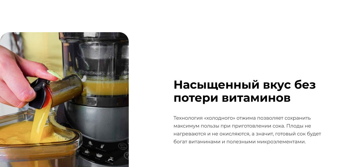 | Отзыв: | Не нужно прилагать никаких усилий при выжимании сока, в отличии от моей старой центробежной |