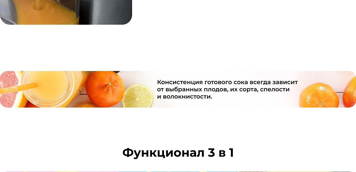 | Минусы: | Немного мякоти цитрусовых всё-таки проходит на выход, но сито, входящее в комплект, здорово помогает. |