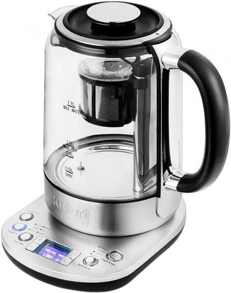 Раньше для приготовления чая я использовал французскую гейзерную электрическую «чаеварку». По сравнению с ней у этого чайника огромное количество плюсов. — Можно использовать как обычный чайник объёмом 1,7 л и как заварочный объёмом 1 л. Минимальный объём 500 мл (т. е. 2 обычные кружки). — Полностью автоматизированный (а значит контролируемый и всегда одинаково точный) способ приготовления очень вкусного чая. Заварка не стоит в воде, благодаря этому в чае нет горечи; при этом вкус раскрывается очень хорошо. — Чай готов очень быстро (мощность чайника 2 кВт обеспечивает быстрый нагрев). — Очень удобный: ненагревающаяся ручка с удобным хватом; хороший носик, с которого не капает; выливается всё содержимое без остатка на дне; возможность поставить на базу под любым углом; верхняя крышка состоит из двух независимо открывающихся частей (ободка и центральной части), что сильно облегчает её открытие для залива воды. — Интуитивно понятное управление: много кнопок для управления, все с аккуратными подписями по-русски; информативный дисплей; подсветка выбранных режимов. — Возможность подбора температуры и времени заваривания чая в зависимости от вида чая (зелёный чай требует более низкой температуры для заваривания) и персональных предпочтений. — Подаёт звуковой сигнал о готовности чая, не слишком сильный, но хорошо слышимый из соседней комнаты. — После приготовления чая может в течение получаса поддерживать температуру 70°: не обязательно пить чай сразу, он не остынет. — Корзина для заваривания и фильтр в носике с очень мелкими отверстиями, которые не пропускают частички заварки за исключением самых мельчайших. Благодаря тому, что они металлические, они прочные и легко чистятся. — Очень стильный (нержавеющая сталь и чёрный пластик). У меня плита, мойка, кухонные органайзеры тоже из нержавейки с чёрными пластиковыми элементами, чайник отлично вписался. — Шум от чайника не очень сильный. |
