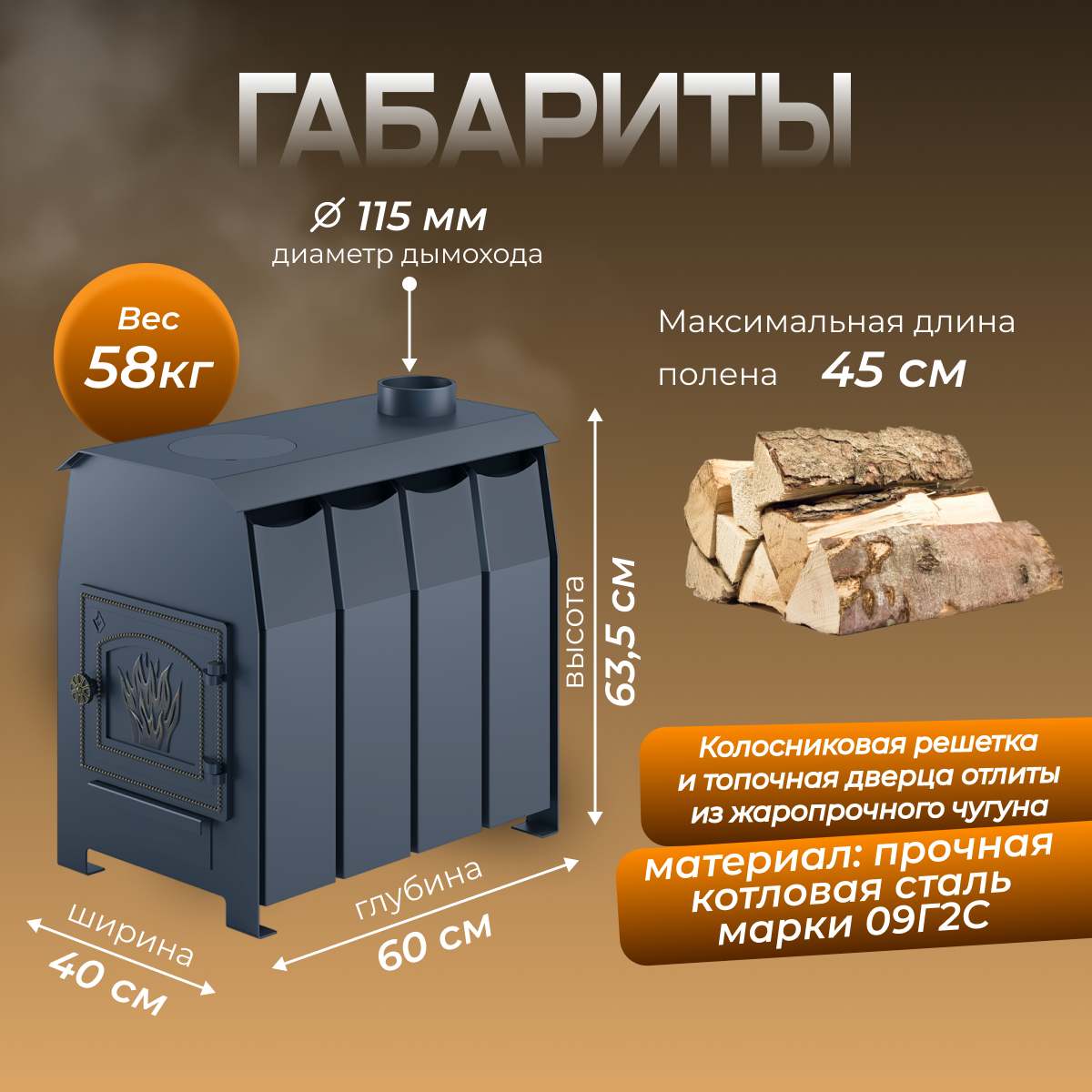| Максимальная длина дров | 60 см |