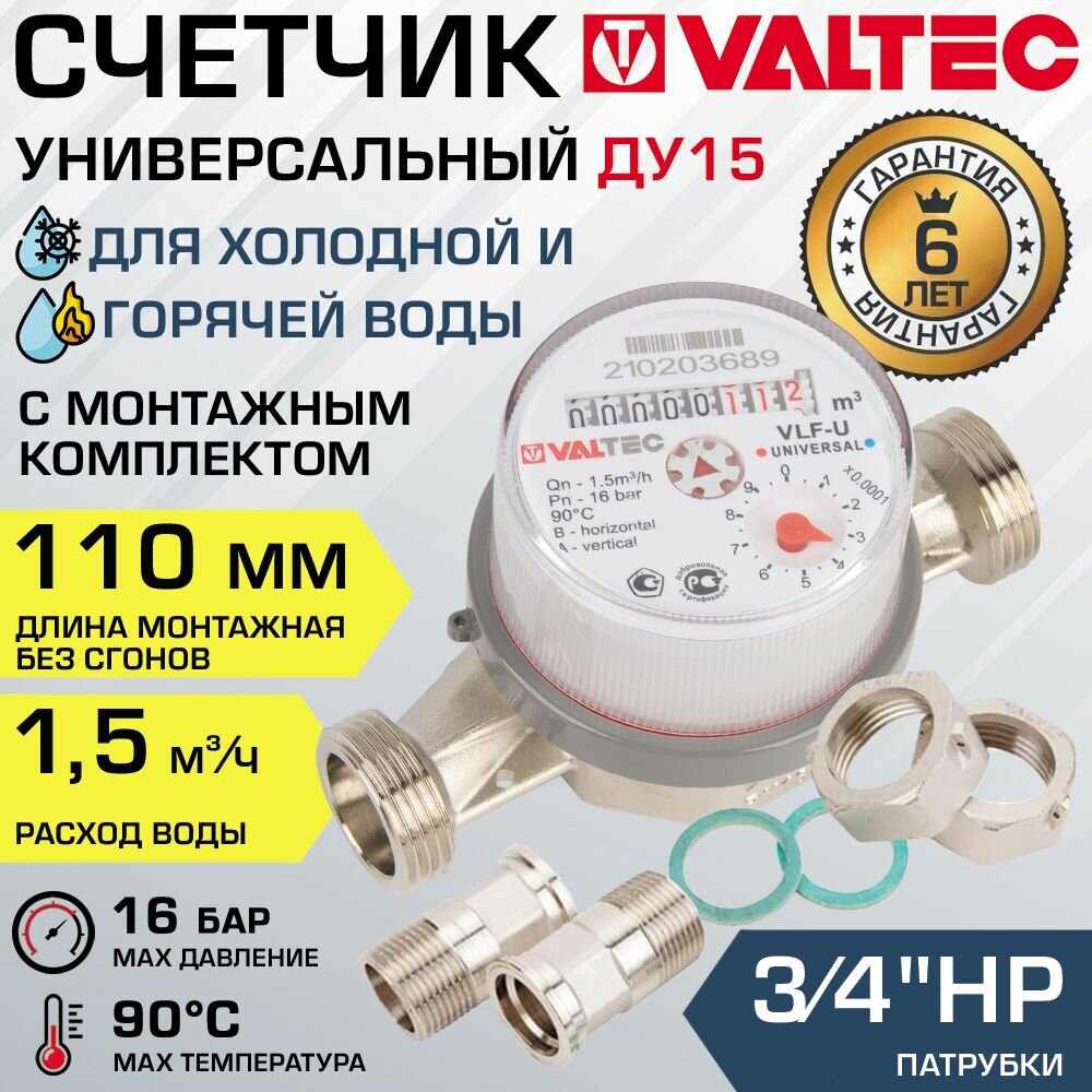 Счетчик для воды 1/2" универсальный VALTEC, длина 110 мм (норма 1.5) / Водосчетчик крыльчатый ДУ 15 для учета расхода горячей и холодной воды в квартире с полусгонами и патрубками 3/4", VLF-15U