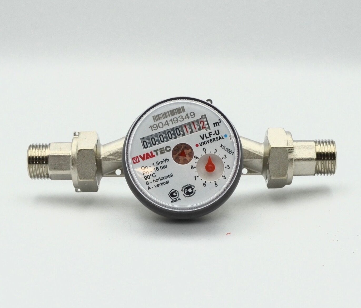 Счетчик для воды 1/2" универсальный VALTEC, длина 110 мм (норма 1.5) / Водосчетчик крыльчатый ДУ 15 для учета расхода горячей и холодной воды в квартире с полусгонами и патрубками 3/4", VLF-15U