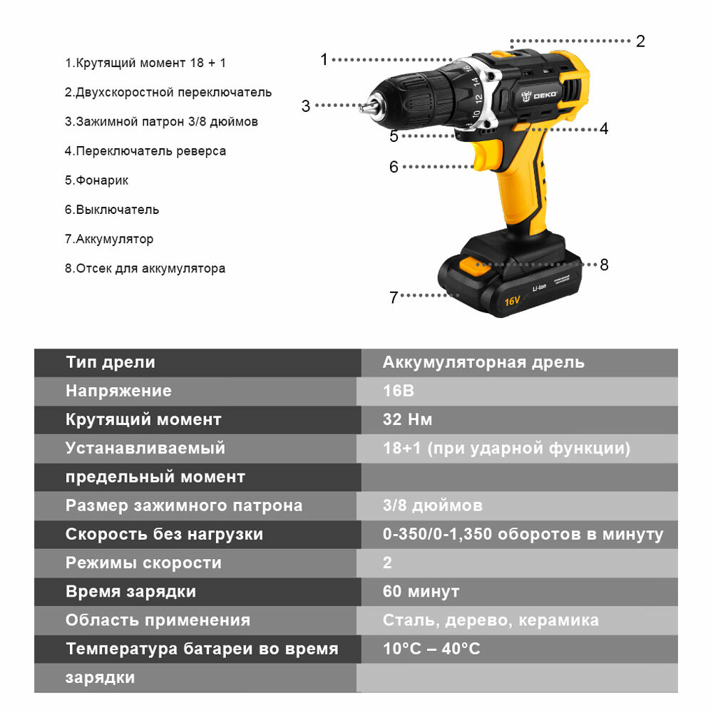 Аккумуляторная дрель-шуруповерт DEKO DKCD16FU-Li (063-4099)