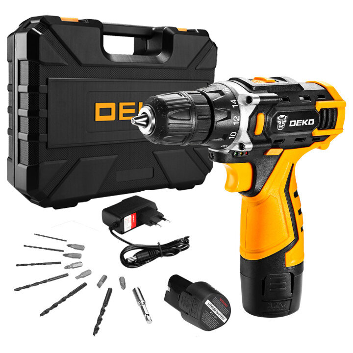 Аккумуляторная дрель Deko DKCD12FU-Li Set3, 2*12В 1.5Ач Li-Ion, оснастка 13 предметов