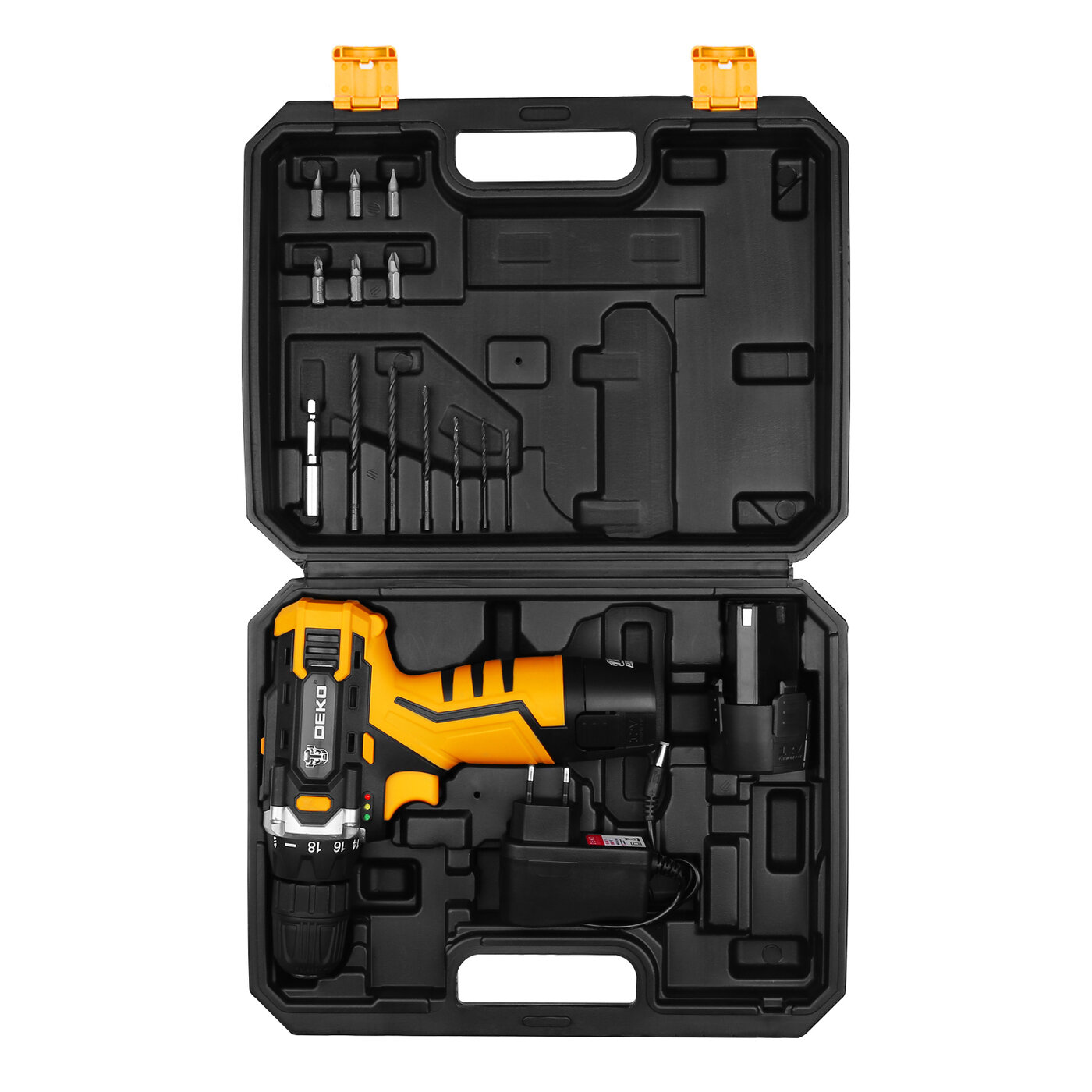 Дрель-шуруповерт аккумуляторная DEKO DKCD12FU-Li 2*12В 1.5Ач Li-Ion, оснастка 13 предметов