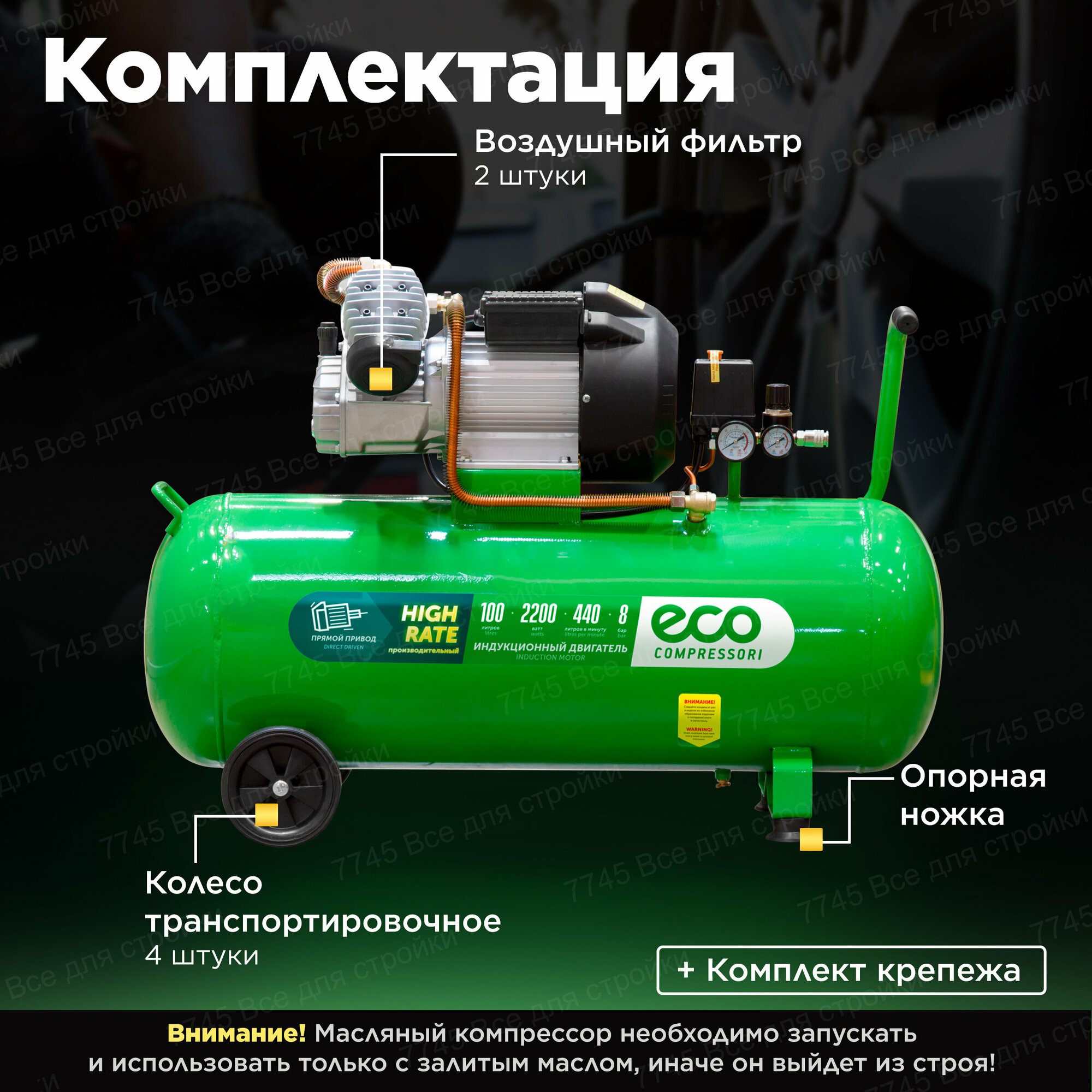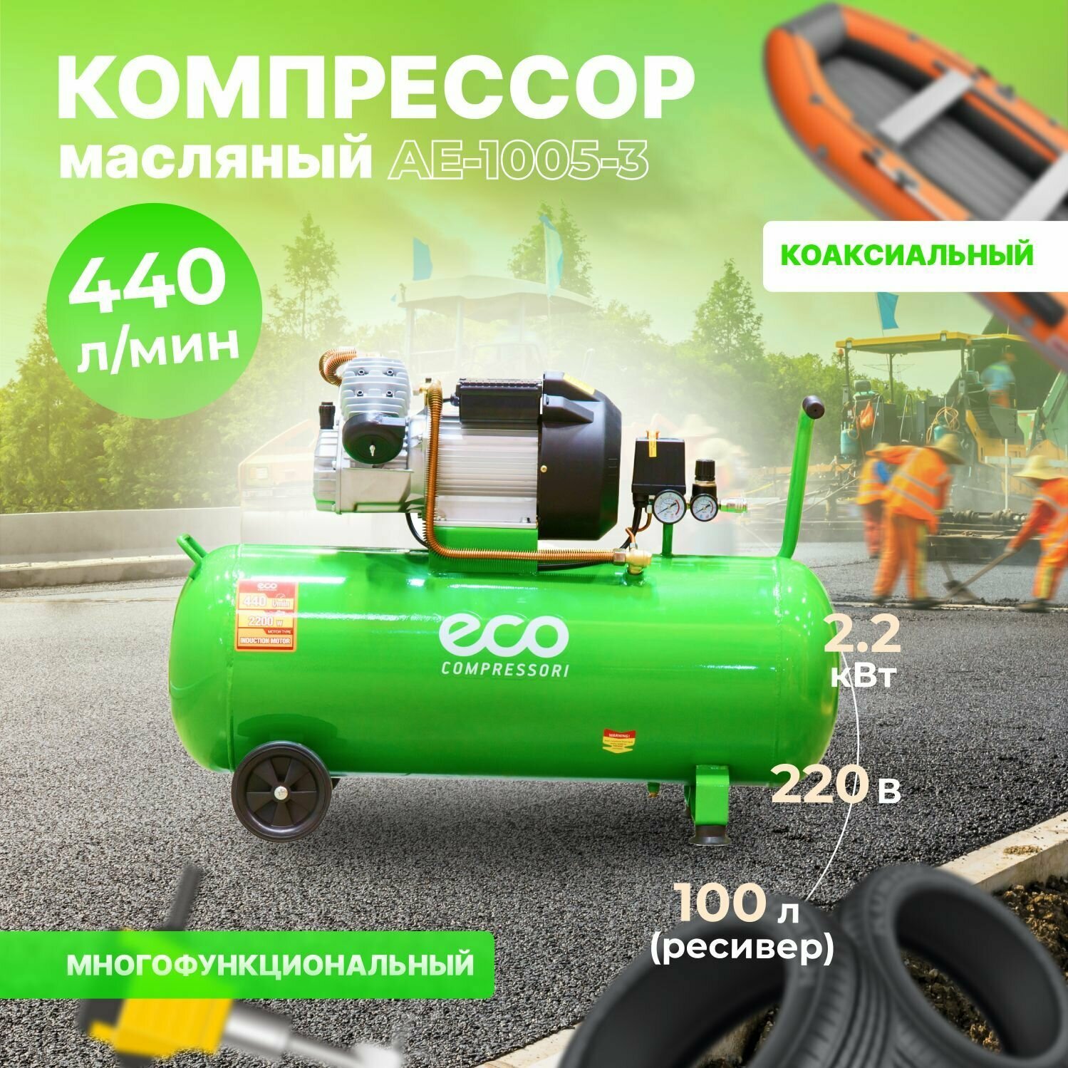 Компрессор Eco AE-1005-3 (440 л/мин, 8 атм, коаксиальный, масляный, ресив. 100 л, 220 В, 2.20 кВт)